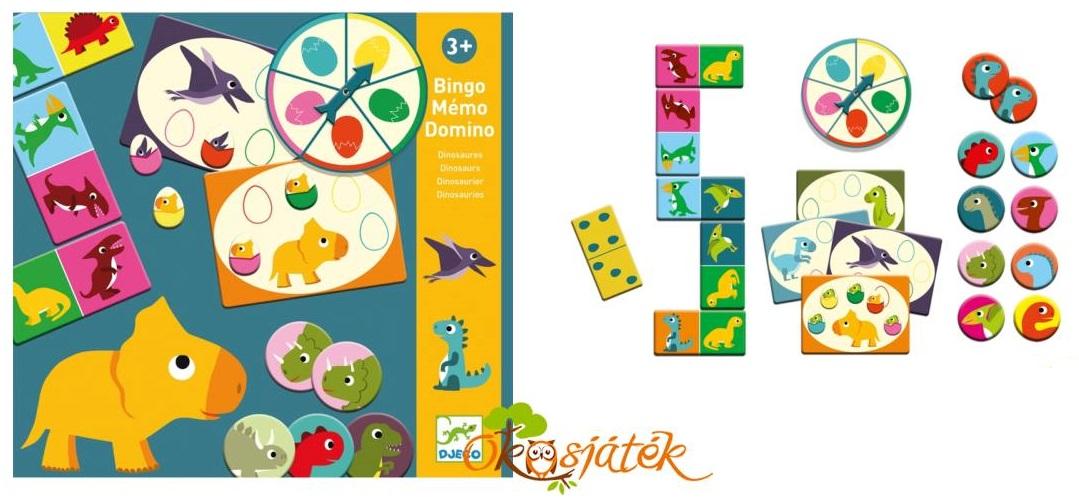 Dínós társasjáték gyűjtemény, melyben a dominó, a bingó és a memóriajáték elemein, lapkáin, mindenhol a dinoszauruszoké a főszerep.