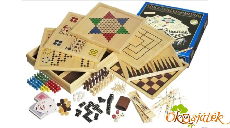 Fából készült játékgyűjtemény, melyben található: kockajáték, malom, halma, backgammon,dáma,sakk,mikado,domino,kinevet a végén, barikád, kínai sakk, 2 pakli francia kártya.