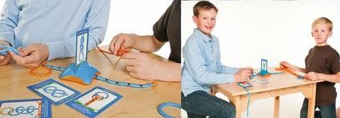 A ThinkFunnak van egy játéka, ami ugyan nagyobbaknak való, de a csomózást nagyon jól lehet vele gyakorolni a kisebbeknek is, amikor még nem a kártyákon szereplő nehezebb feladatokat csinálják, hanem „csak” a sima csomót, cipőbekötést. Ideális a vastagsága, könnyen szét is szedhető, nem kell bajlódni a csomó(k) szétvarázsolásával.