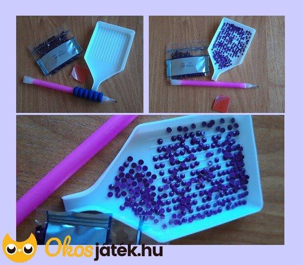 A kövek felhelyezésében segít a csomagban lévő speciális toll, amelynek a végét időnként bele kell nyomni a készlethez mellékelt viasz/szilikon lapocskába, hogy a kövek rátapadjanak a tollra, így könnyen felhelyezhetők lesznek a vászonra.