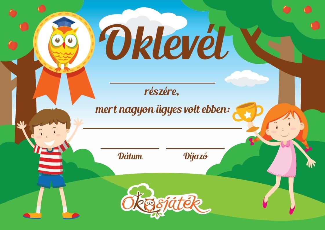 A fenti oklevél A5 méretben már kinyomtatva, papírból megvásárolható az Okosjáték webáruházban: