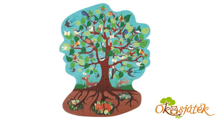 Gyönyörű, részletgazdag, 58 darabos puzzle, mely kirakva egy nagy lombos fa madaraktól nyüzsgő képét tárja elénk.