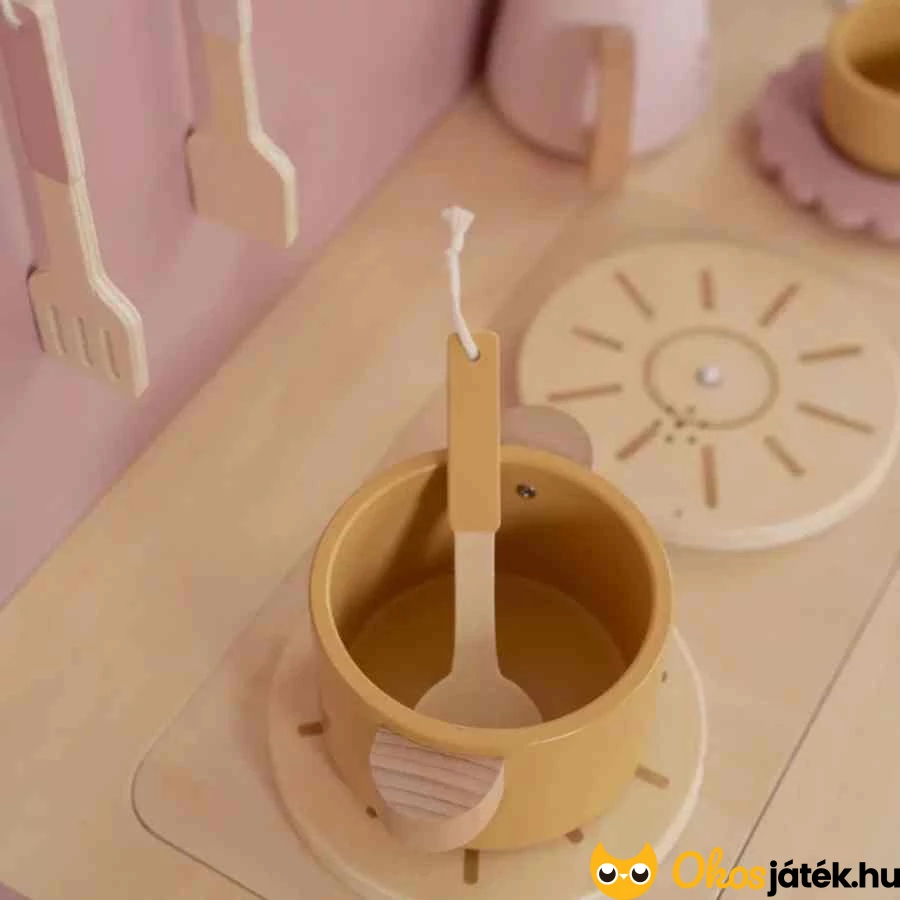 A fából készült pink konyhában minden megtalálható, ami a főzőcskézéshez kell: sütő, főzőlap, mosogató és praktikus kiegészítők, hogy kislányod elkészíthesse a legfinomabb ételeket.