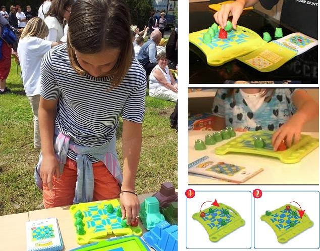 A dobozból egy játéktábla, azaz a tó, valamint pár mókás kis zöld breki került elő. Hirtelen vagy talán véletlenül, de felbukkant egy piros béka is :"-Ajaj! Apa, ezzel meg mi történt? "-hallottam Esztit, miközben egy feladványfüzet is a kezembe akadt.