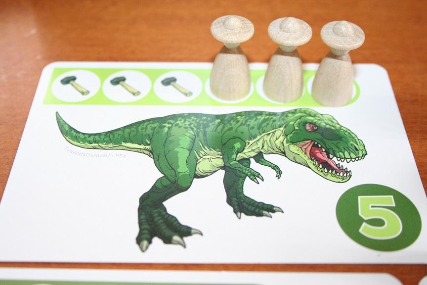 Először rosszul játszottuk a fiammal. Miután gyanús lett, hogy egy dino kártya után bátran lehet dobni és tovább gyűjteni, elolvastam újra a szabályt. Ha már úgy döntök, hogy nem dobok tovább, csak akkor vehetem el a dino kártyáját (amennyiben már az elkapásához szükséges eszközök mind le vannak takarva). Ha úgy döntöttem, hogy folytatom a dobást, de nem sikerül olyan eszközt dobnom ami még látható a dino kártyákon (vagyis nincs letakarva a fa bábukkal), akkor azt a kártyát is "elveszítem", amit egyébként megnyertem volna.