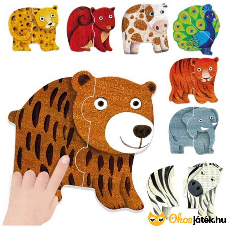 A tapintásfejlesztő játékban a gyerekek 8 állatot rakhatnak ki, egyenként két részből. Az elemek nagyok, kiváló minőségű vastag kartonból készültek, az állatok ábrázolása nagyon kedves, a színek élénkek.