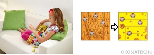 A játék tartalma: 1 db mágneses spirál könyvecske, 8 db mágneses sajtlapka dekorgumiból, 6 db mágneses egérke.