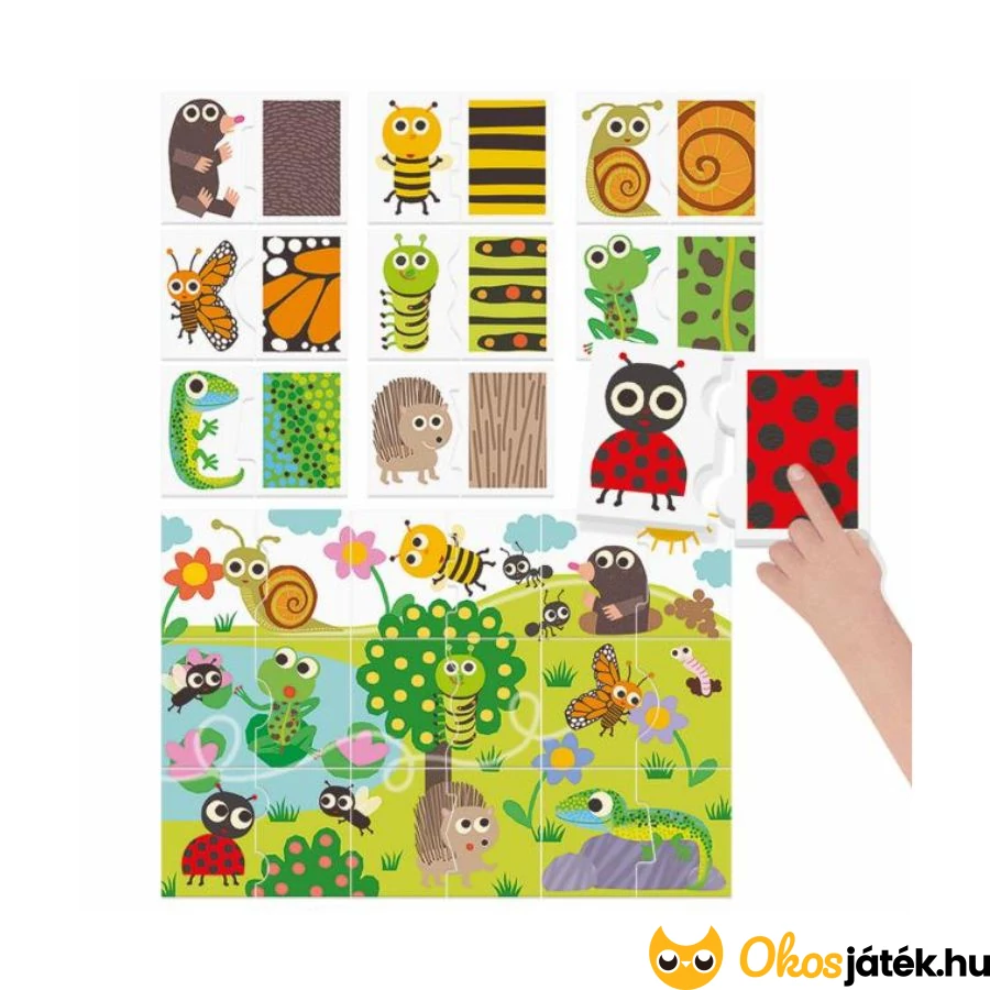 A játék során a kicsik megismerkedhetnek különböző állatokkal és azok jellegzetes bundájával, bőrével vagy tollazatával. A Montessori-módszer inspirálta kirakó tökéletes választás a tapintásos tanulás és a megfigyelőkészség fejlesztésére.