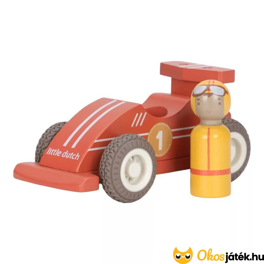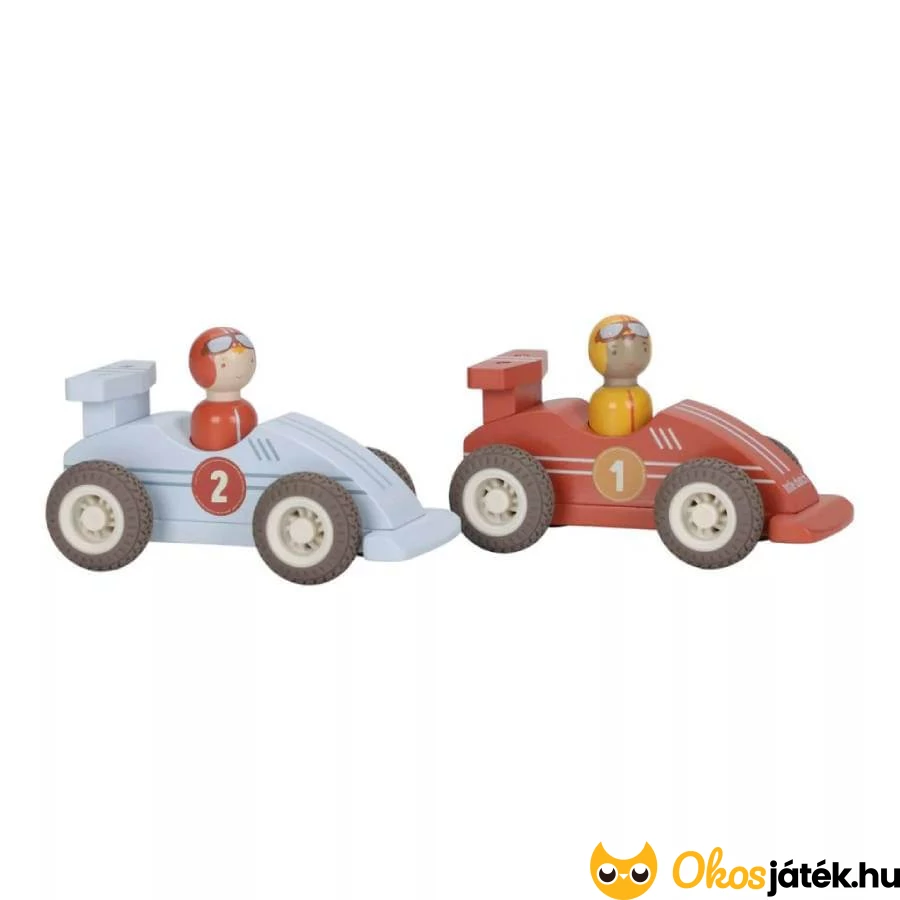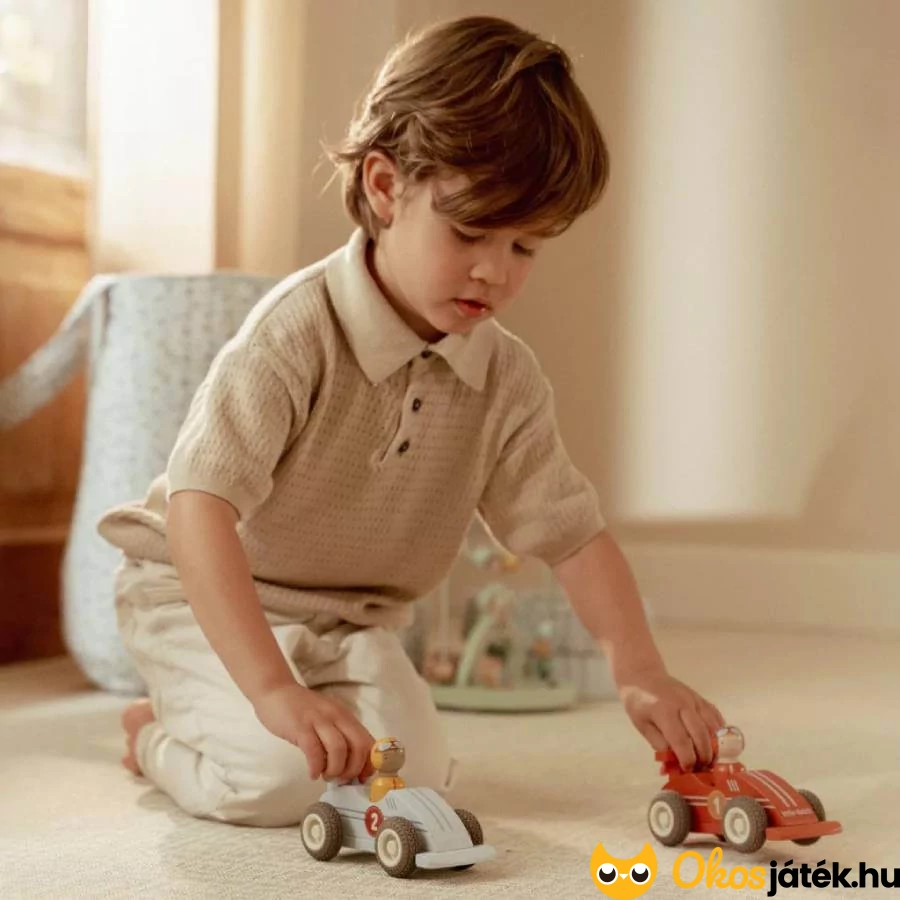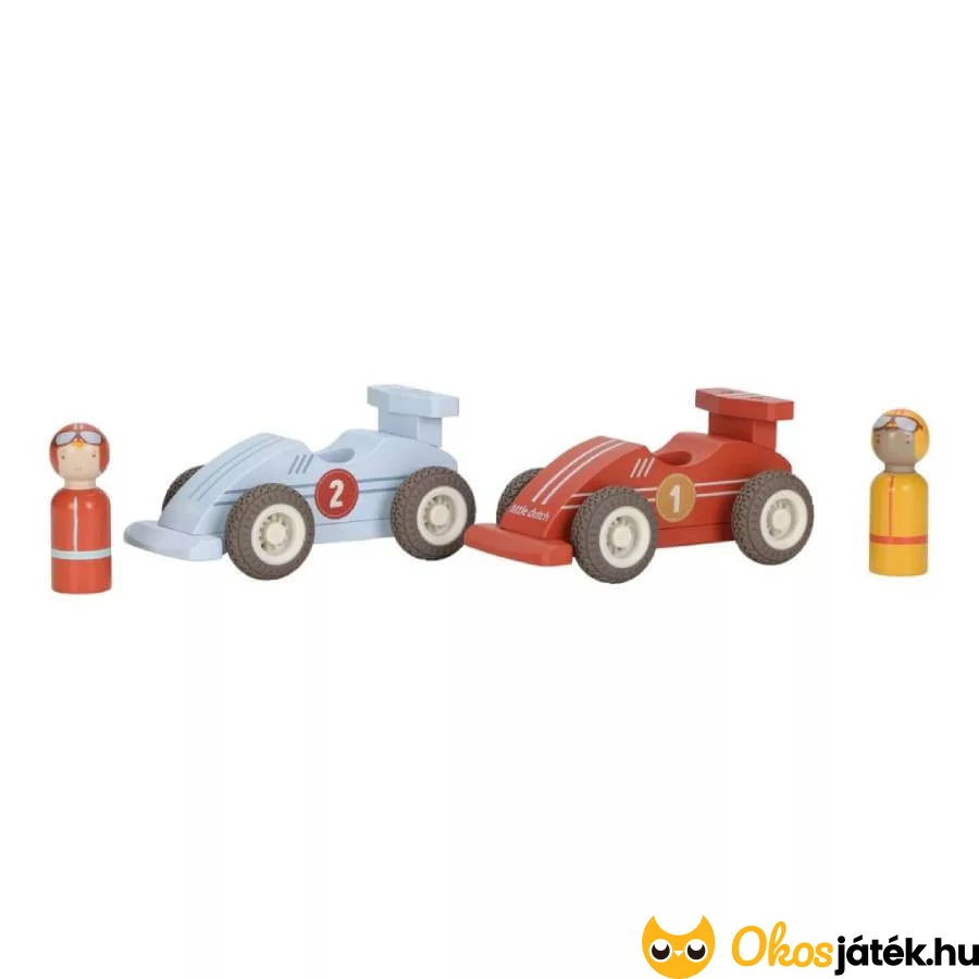 Vidám, fából készült versenyautók pilótákkal a Little Dutch holland márkától. A kocsik pull-back mechanikával mozognak.