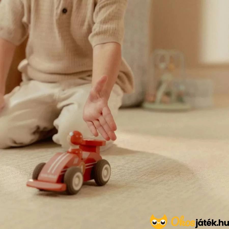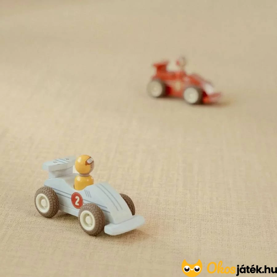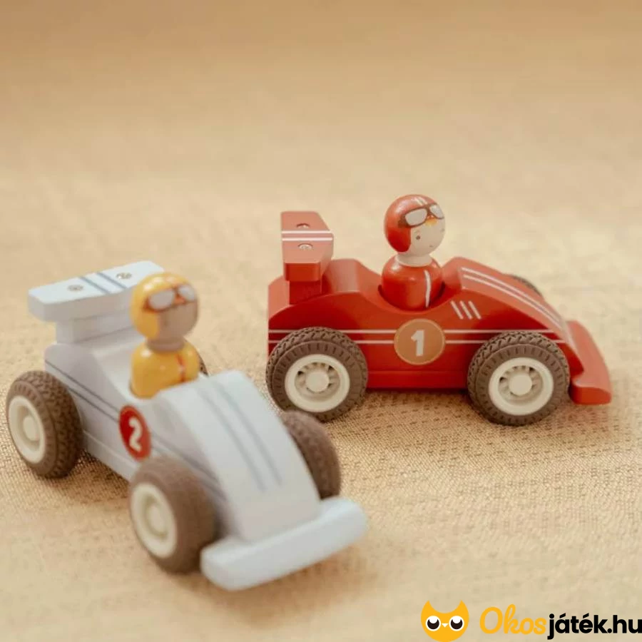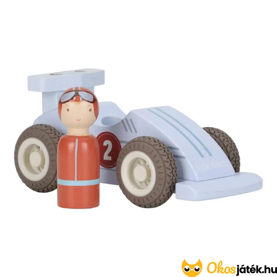 Vidám, fából készült versenyautók pilótákkal a Little Dutch holland márkától. A kocsik pull-back mechanikával mozognak.
