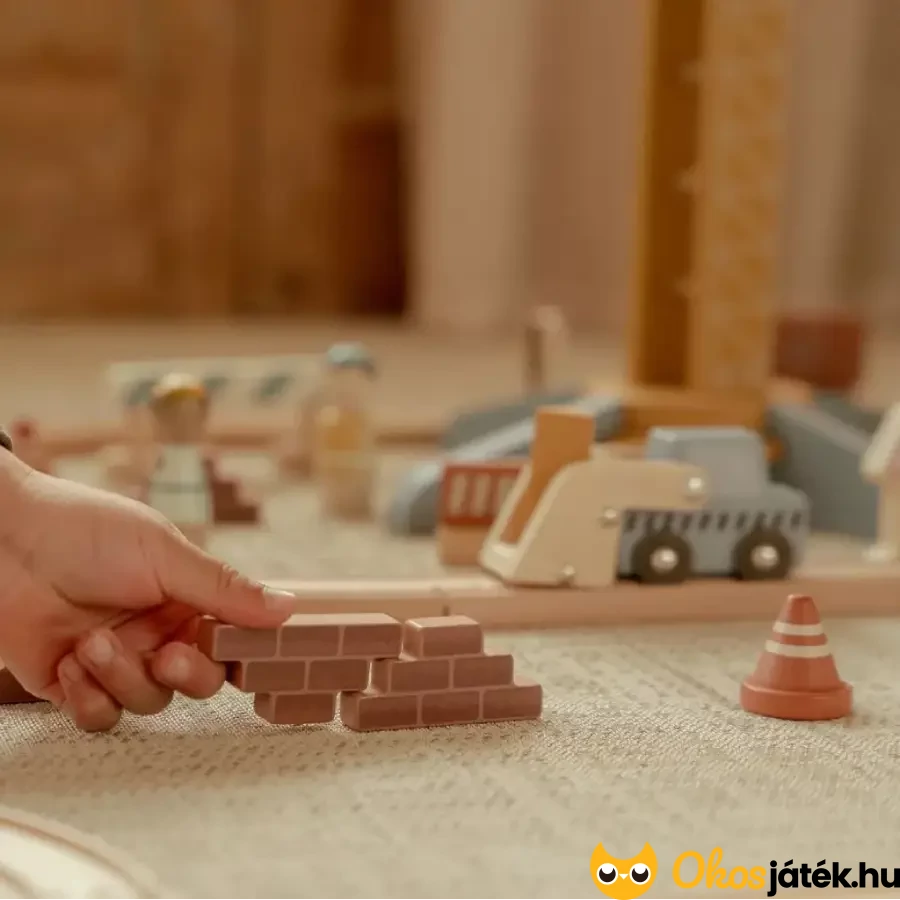 A gondosan megtervezett fa sínpálya és a mozgatható daru lehetővé teszi, hogy a gyerekek saját, forgalmas építési területet alakítsanak ki, ahol a rakományokat felemelhetik, áthelyezhetik és pakolhatják. A játék kiválóan alkalmas szerepjátékra, hiszen a gyerekek igazi építkezési környezetet hozhatnak létre, ahol ők maguk lehetnek a darukezelők, sofőrök vagy építésvezetők.