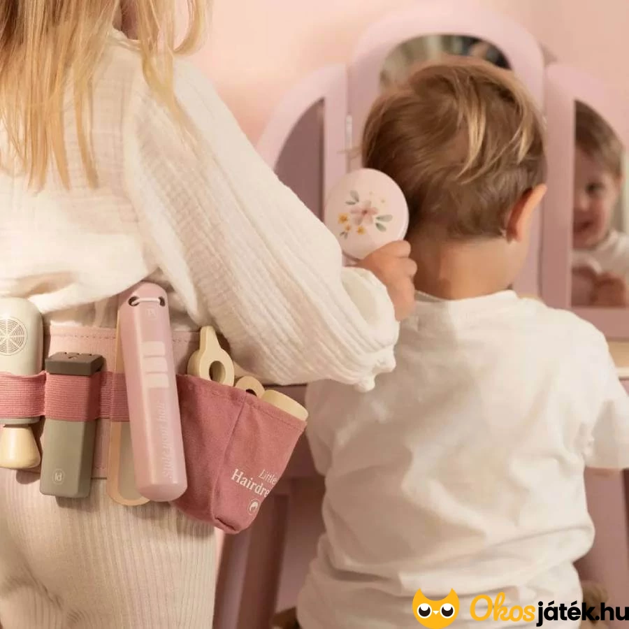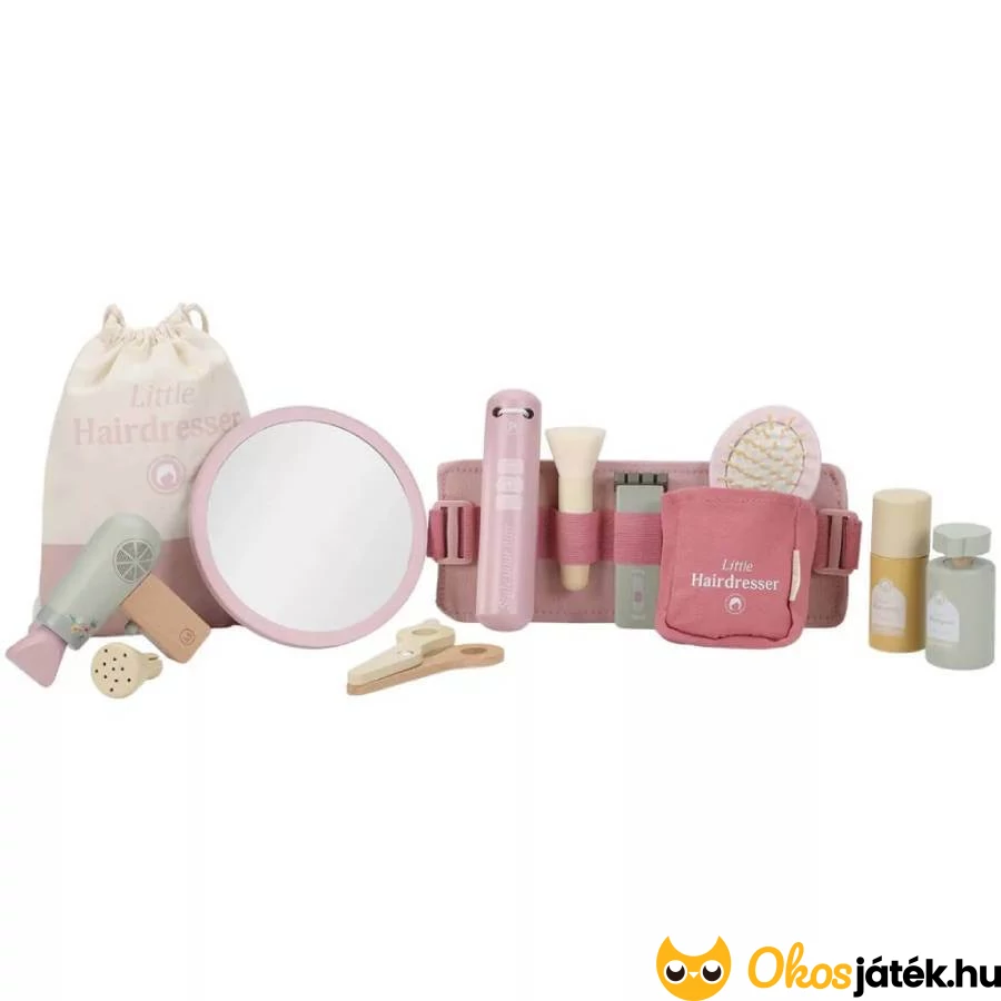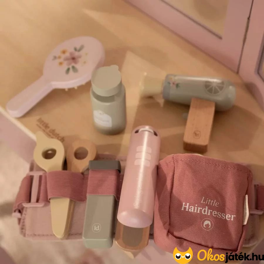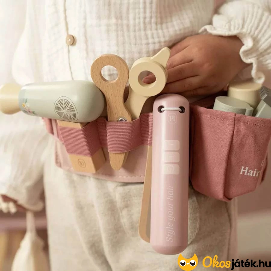 A szerepjátékokat kedvelő lányoknak igazi kincs ez a fodrász készlet, mely mindent tartalmaz, ami ahhoz kell, hogy a gyerekek megismerkedjenek ezzel a mesterséggel. A készletben található eszközök fából készültek, ezért strapabíróak, biztonságosak. A szettben a pasztell rózsaszín szín dominál, így kislányoknak igazi csajos ajándék. Az övtáska állítható és alkalmas a kisebb eszközök praktikus tárolására, míg a nagy eszközök a készletben található zsákban kaptak helyet.