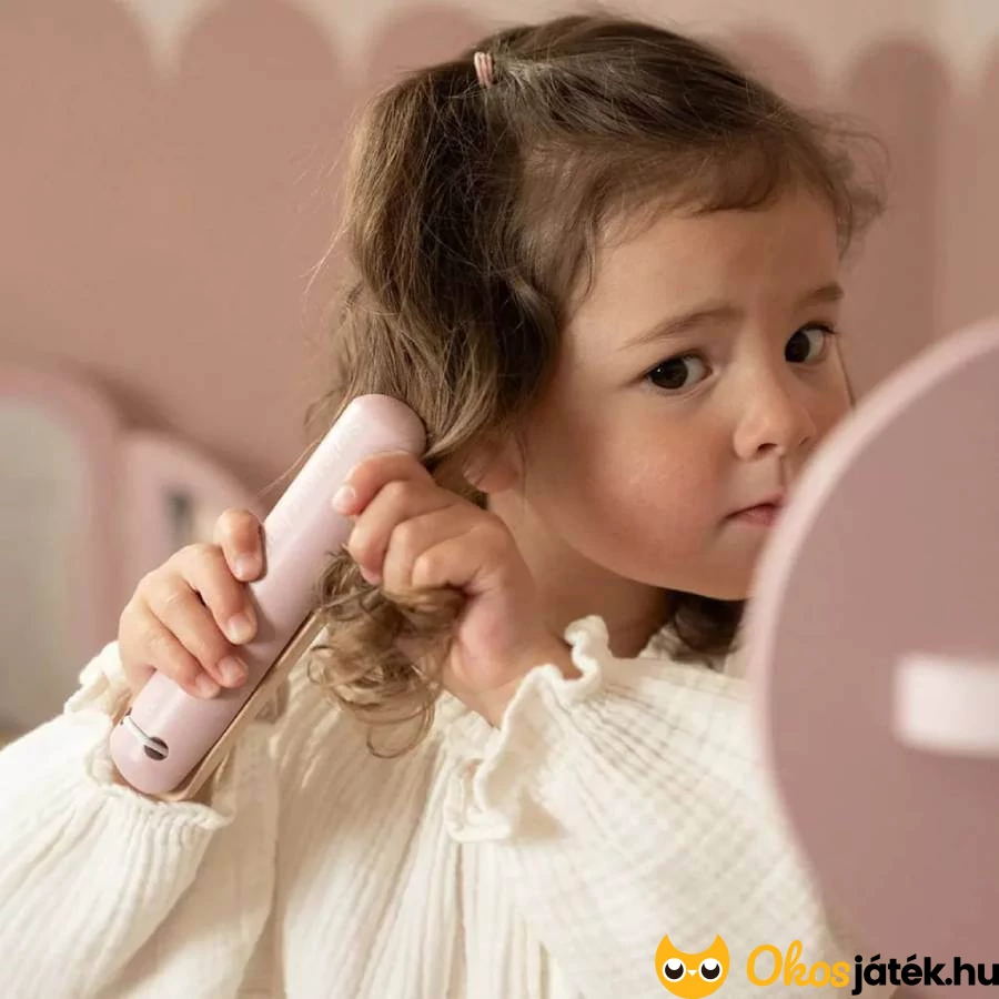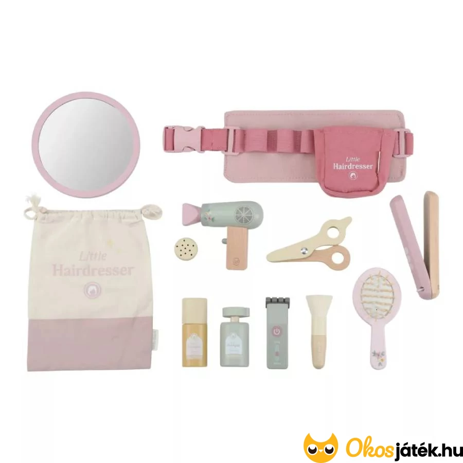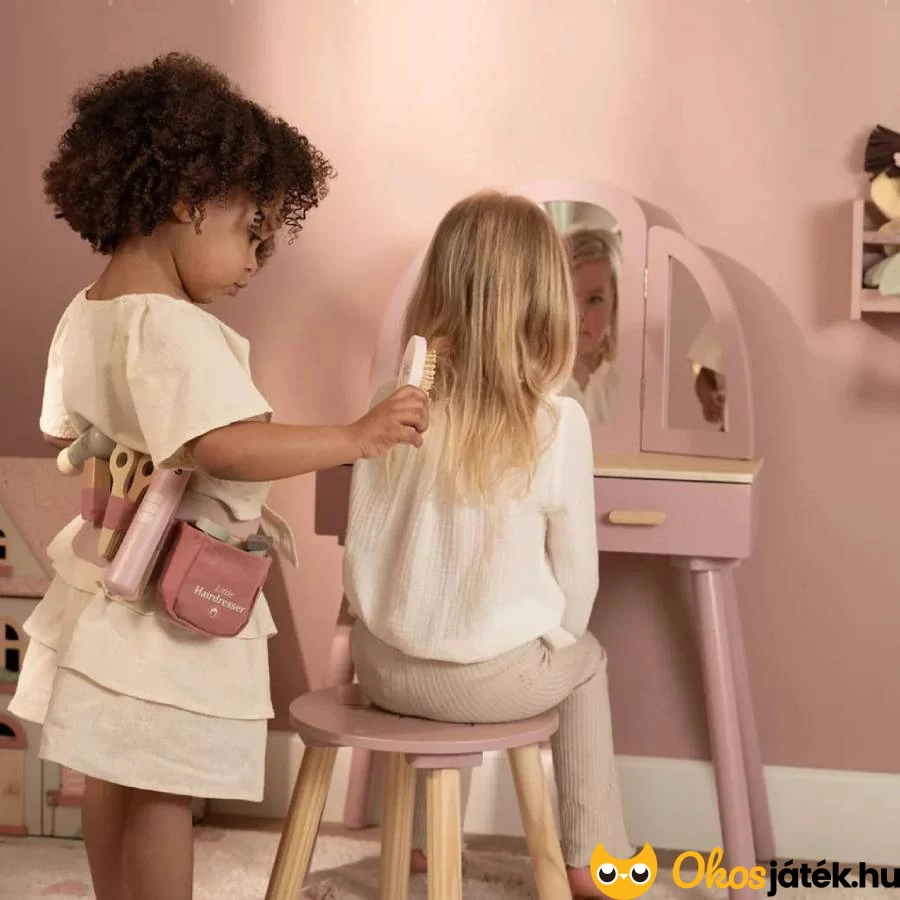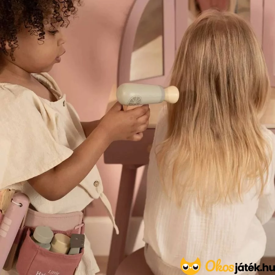 A szerepjátékokat kedvelő lányoknak igazi kincs ez a fodrász készlet, mely mindent tartalmaz, ami ahhoz kell, hogy a gyerekek megismerkedjenek ezzel a mesterséggel. A készletben található eszközök fából készültek, ezért strapabíróak, biztonságosak. A szettben a pasztell rózsaszín szín dominál, így kislányoknak igazi csajos ajándék. Az övtáska állítható és alkalmas a kisebb eszközök praktikus tárolására, míg a nagy eszközök a készletben található zsákban kaptak helyet.