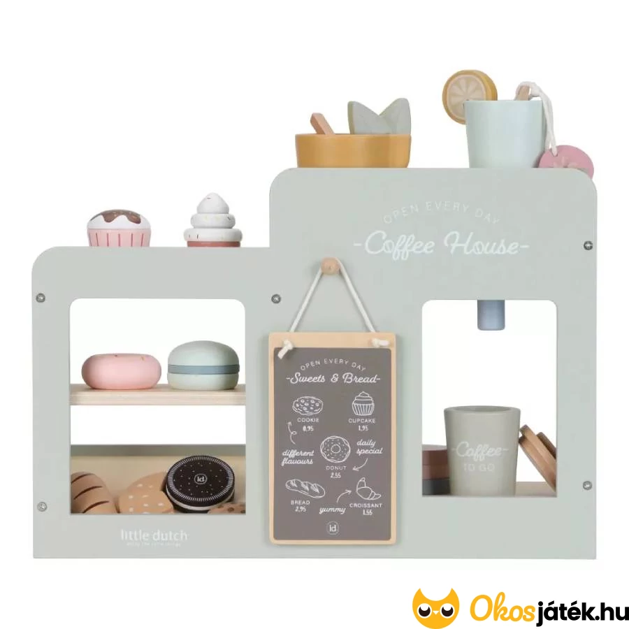 A kávézó kialakítása lehetővé teszi, hogy minden rendezetten tárolható legyen. A polcokon a finomságok, a gépben a csészék és poharak, a kis rekeszekben pedig elfér a többi kiegészítő. A készletben található egy tábla, ami könnyen felakasztható a kávézó hátoldalán található akasztóra.