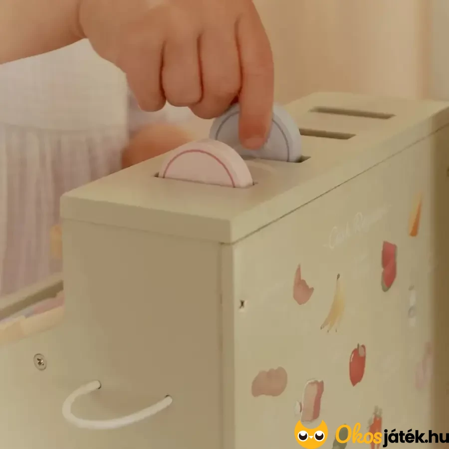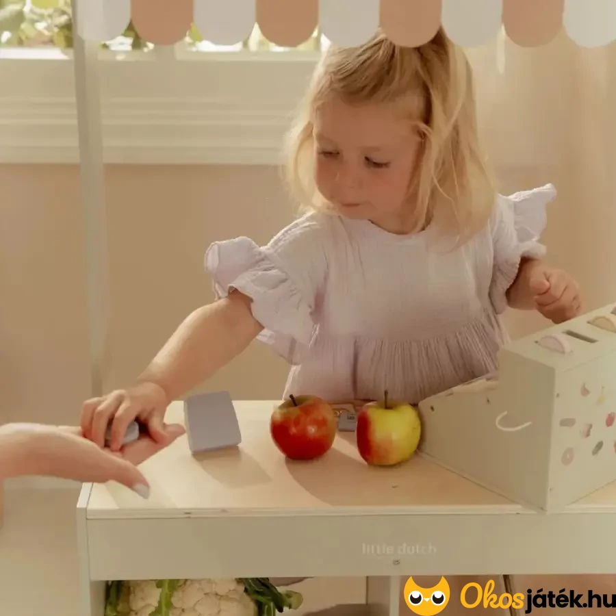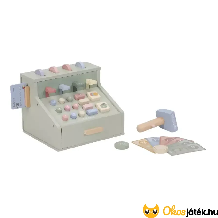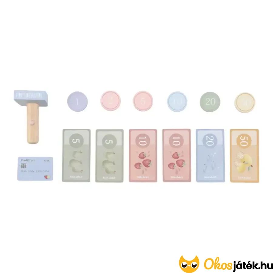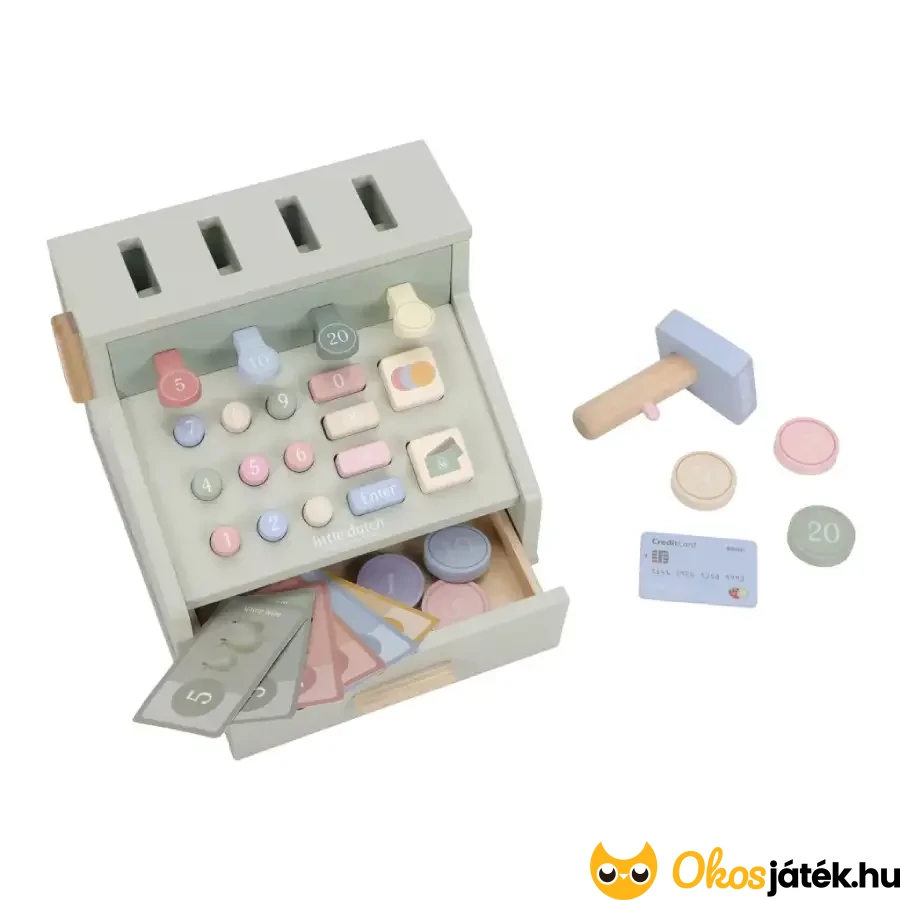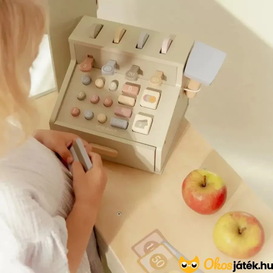 A Little Dutch gyönyörűen megmunkált fa játék pénztárgépe segít a gyerekeknek megismerni a számokat, a pénz használatát és a vásárlás élményét játékos formában.