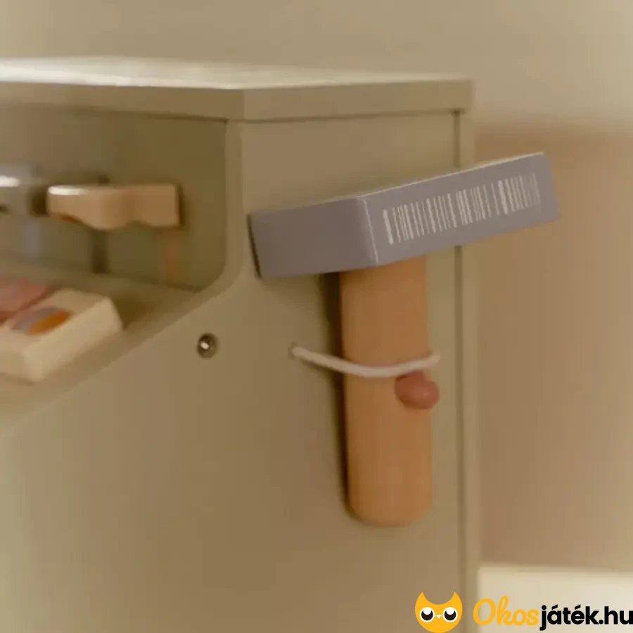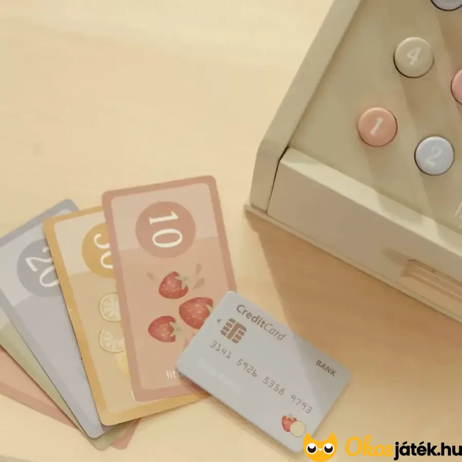 Kellemes pasztell zöld színével és vegyes színű gomjaival egyből elnyeri a gyerekek tetszését. A gombok nyomogatása és a kasszafiók nyitogatása, a játékpénz használata igazi pénztárgépes élményt nyújt, így a kicsik könnyen beleélhetik magukat a mindennapi vásárlási helyzetekbe.