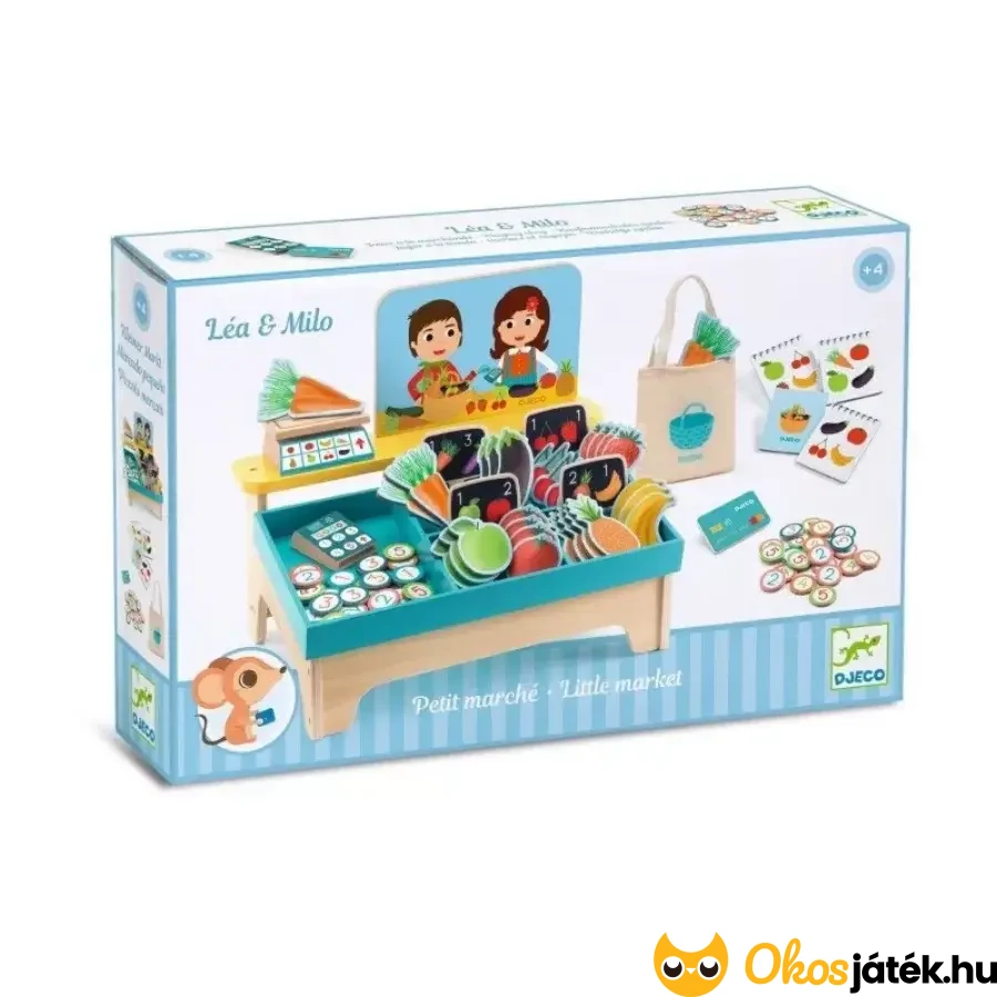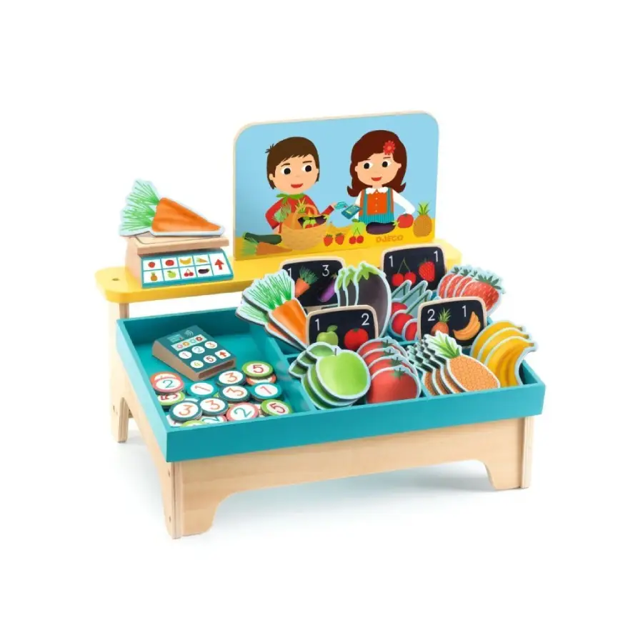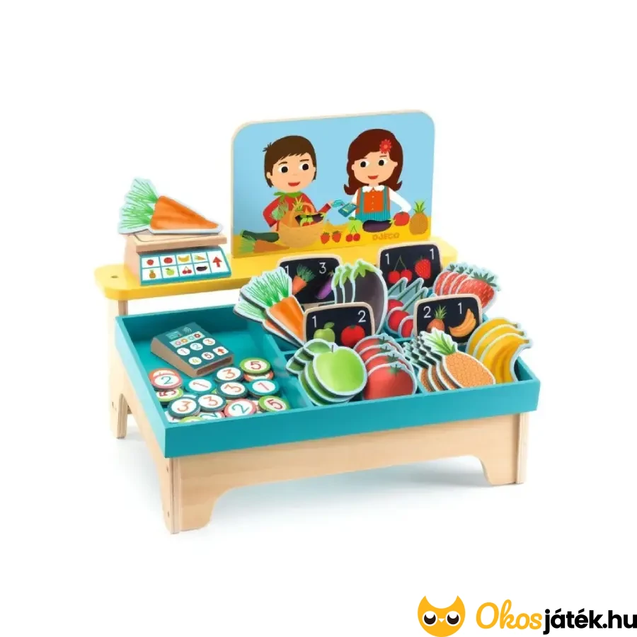 Aranyos zöldség- és gyümölcs standos szerepjáték a francia Djeco játékgyártótól kimondottan 4 éves kortól, mellyel a gyerekek boltosként, vagy vásárlóként is kipróbálhatják magukat. A készlet rengeteg kiegészítőt tartalmaz mellyel izgalmassá varázsolható a szerepjáték.