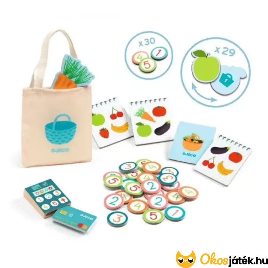 Az eladópult mellett fa játék mérleg is tartozik a szetthez, valamint hogy élethű legyen az eladás-vásárlás fa bankkártyaolvasó és Djeco-s bankkártya is a készlet része. Mindezek mellett bevásárlólisták, vászon szatyorka, valamint játékpénzek is tartozékok, teljessé téve a vásárlás és eladás élményét.