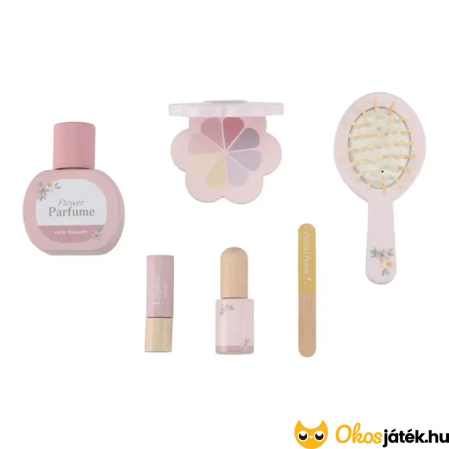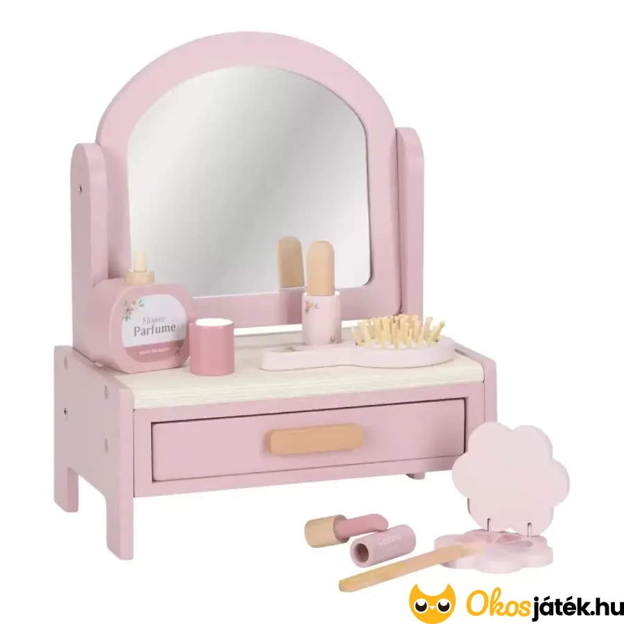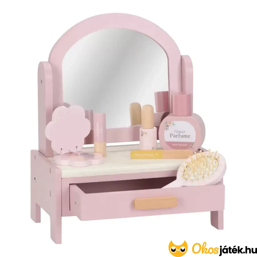 A pasztell rózsaszín fésülködős asztalka nemcsak esztétikus, hanem remek lehetőséget kínál a gyerekek számára a szerepjátékra és az önkifejezésre. A készlet tartalmaz egy beépített tükröt, egy fiókot, melyben kényelmesen elférnek a szetthez tartozó egyéb kiegészítők. A készlet olyan elemeket tartalmaz, mint például hajkefe, rúzs, parfüm, szemhéjfesték, körömreszelő, körömlakk, melyekkel a gyerekek eljátszhatják a mindennapi szépítkezési rutinjaikat.