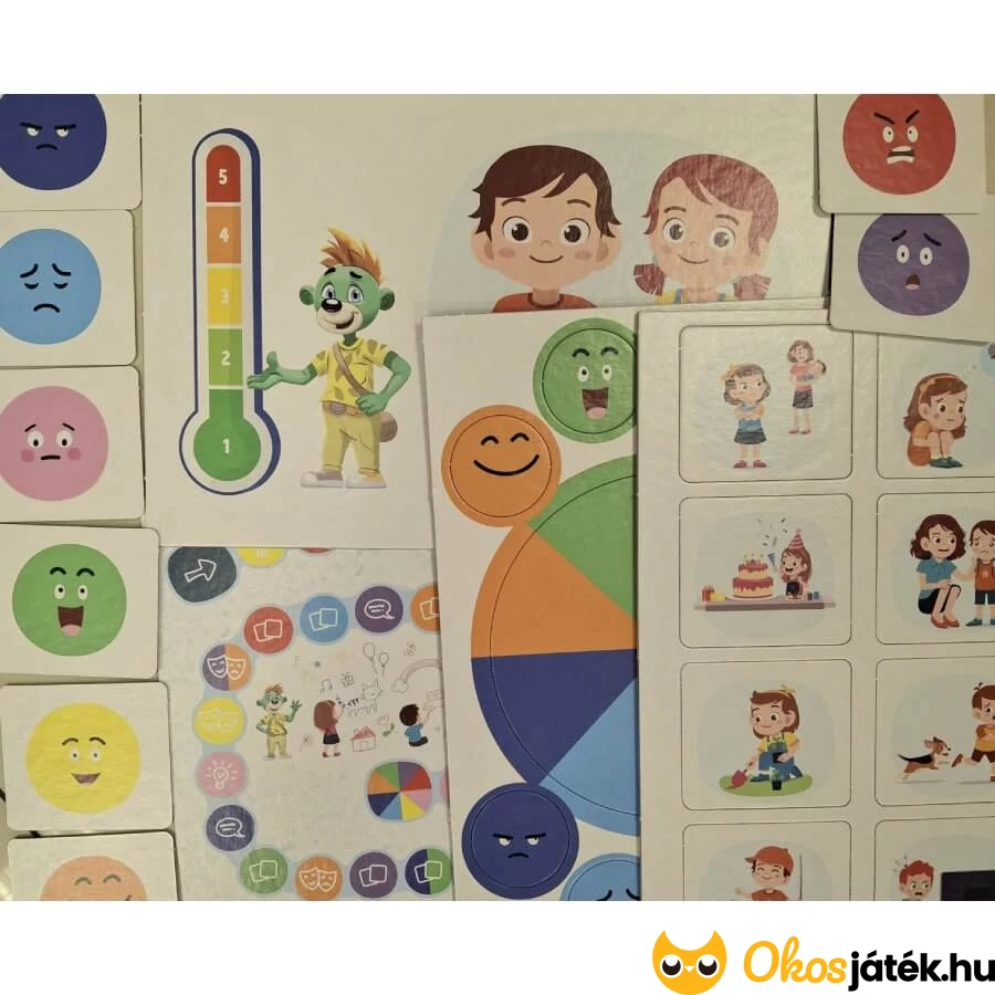 Az „Érzések” oktatójáték különféle érzelem- és helyzetkártyákat, valamint színes, élettel teli karaktereket tartalmaz, amelyek különböző élethelyzeteket mutatnak be.