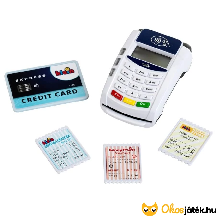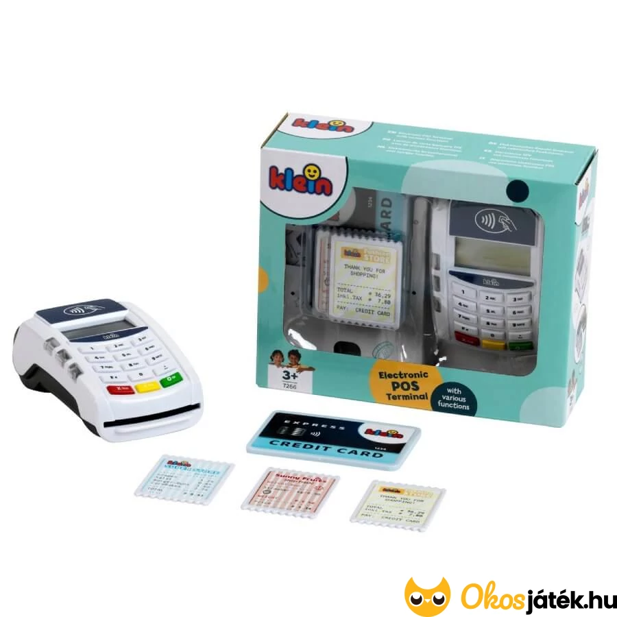 A játék Klein POS terminál fénnyel és hanggal jelzi a fizetést, miután a vásárló a terminál oldalához érinti a játék bankkártyát, vagy behelyezi a kártyaleolvasóba. A valósághű készülék digitális kijelzővel rendelkezik.