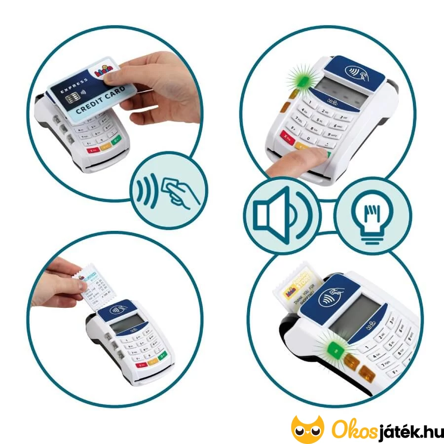 A bevásárlós játékokat kedvelő gyerekek örömmel fogják használni az elemmel működő játék bankterminált, ami tökéletes pénztárgép kiegészítő. Segítségével gyakorolhatják a bankkártyás fizetést a szerepjáték alkalmával.