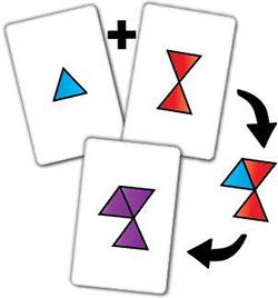 Mi az a Zangle? Két vagy több kártya, ami kiadja egy harmadik formáját. A szín nem számít, az alakzatokat forgathatod gondolatban. Ez az ábra mutatja, hogy pl. két kártyából egy harmadik összehozható, így ez egy Zangle: