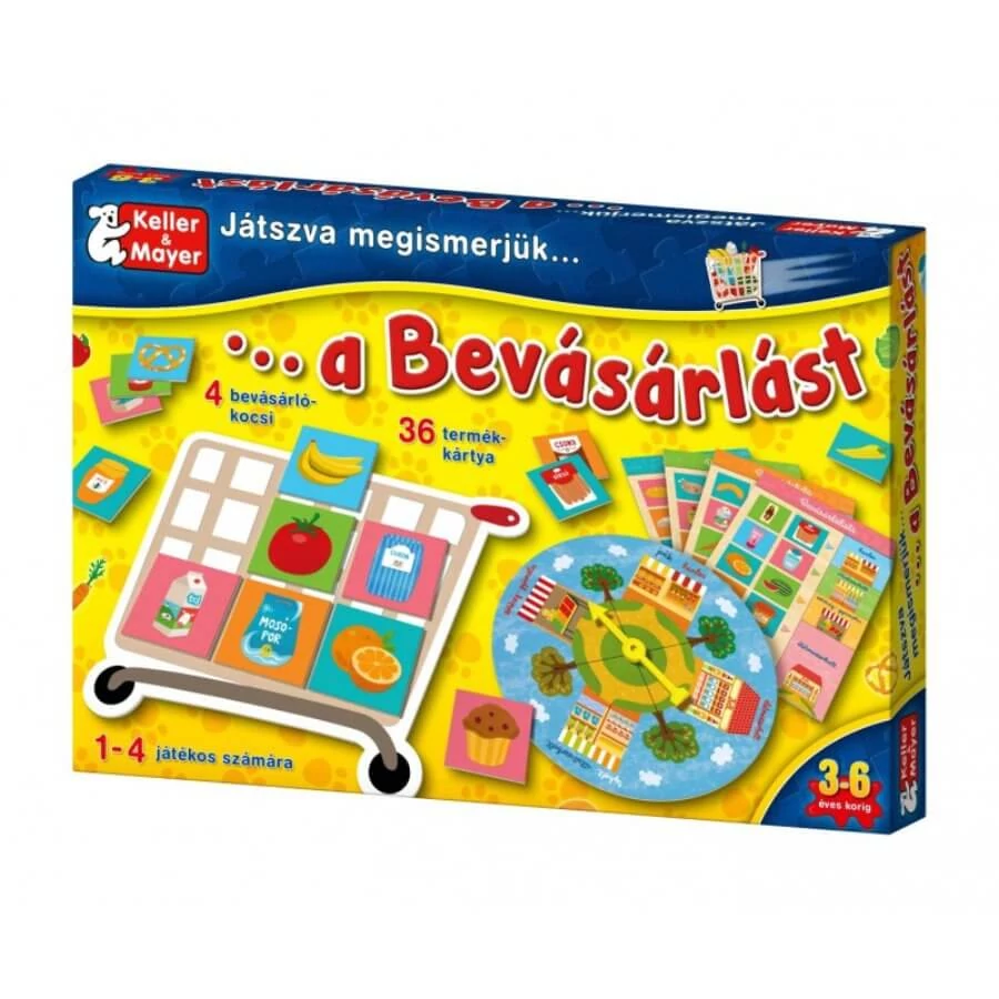 Kétféleképpen játszható bevásárlós társasjáték a Keller és Mayertől, melyben a gyerekek megismerkedhetnek a különböző termékekkel és azokkal a helyekkel is ahol ezek a dolgok kaphatók. A Játszva megismerjük sorozat egyik tagja.