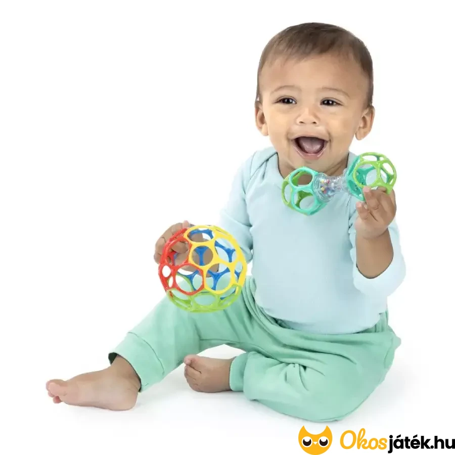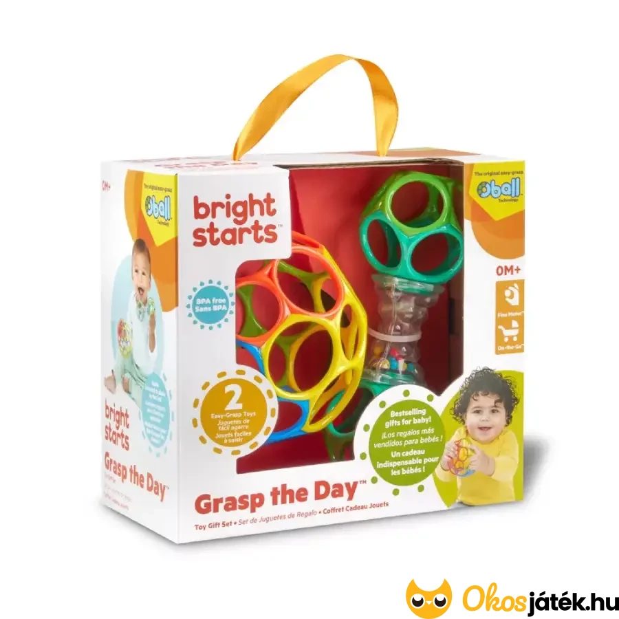 A szett tartalmaz egy könnyen megfogható Oball labdát és egy súlyzó alakú csörgőt, amelyek vidám színeikkel és praktikus kialakításukkal hosszú időre lekötik a babák figyelmét.