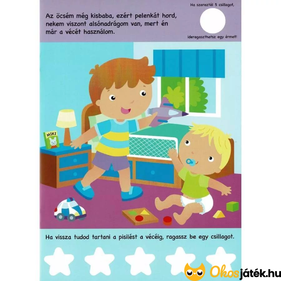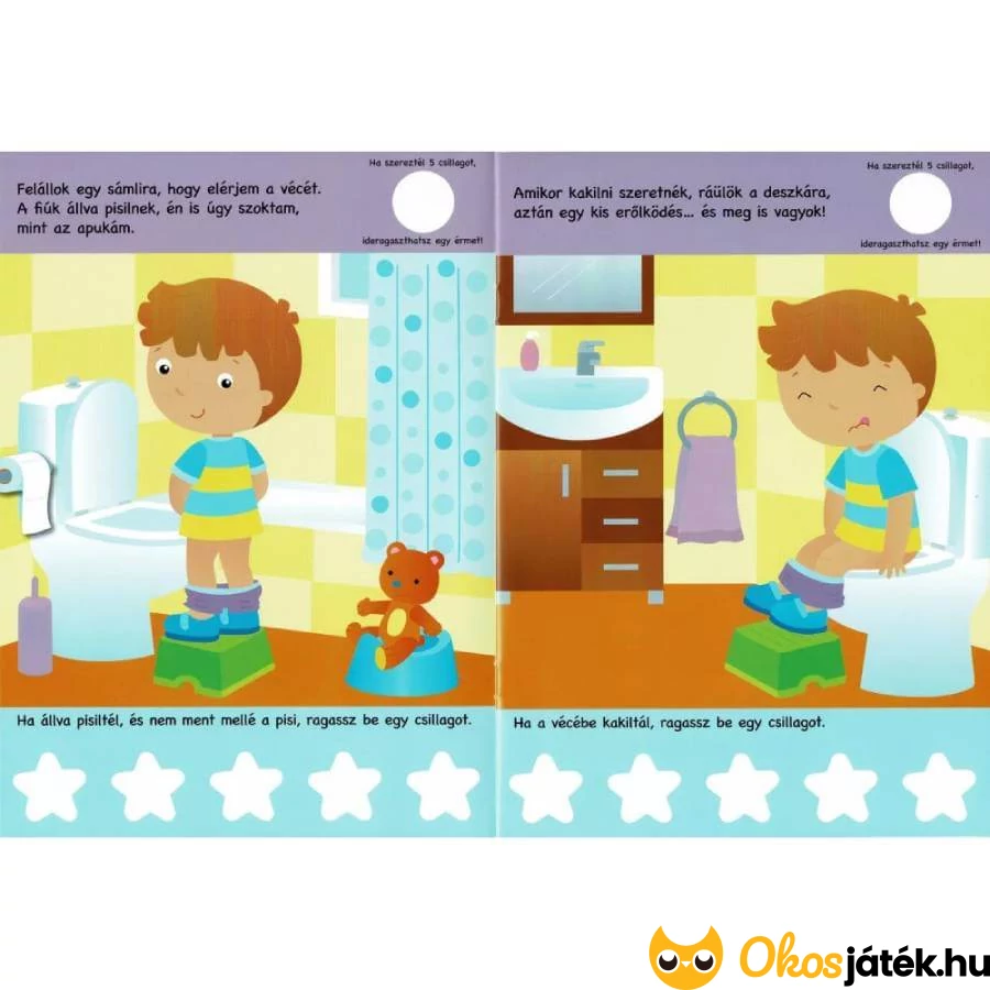 A szobatiszta leszek jutalmazó matricás füzet játékra hívja a gyerekeket, amiben küldetéseket lehet teljesíteni, jutalmak vannak, így a szorongás oldása máris megtörténhet, ahogyan a pozitív visszajelzés is. Emellett sokat beszélgessetek a gyermekkel, vonjatok be plüssállatokat, szőjétek mesékbe a bilizést.