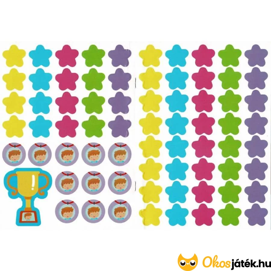 Az oldalak alján 5 hely van a matricák beragasztására, ami akkor történhet meg, ha a kisgyermeknek sikerül a feladatot elvégeznie. Amikor az 5 hely betelik, akkor a lap tetejére ragaszthat a gyermek egy mosolygós kisfiú fej matricát. Amint az összes matricát beragaszthattuk, megkapja a gyermek a serleg matricát is.