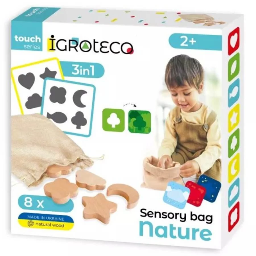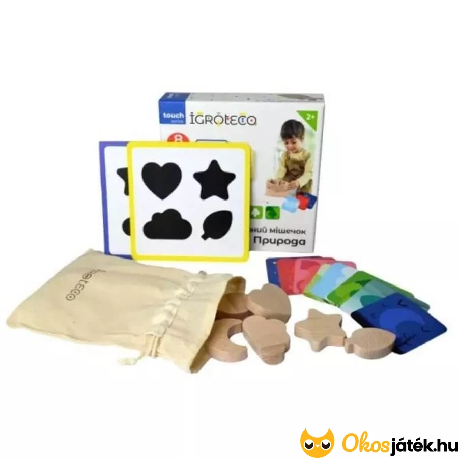 Tapintást fejlesztő fajáték kicsiknek, melyben a fa elemeket kell kitapogatniuk a gyerekeknek, hogy megtalálhassák a mintakártyán látható formát.