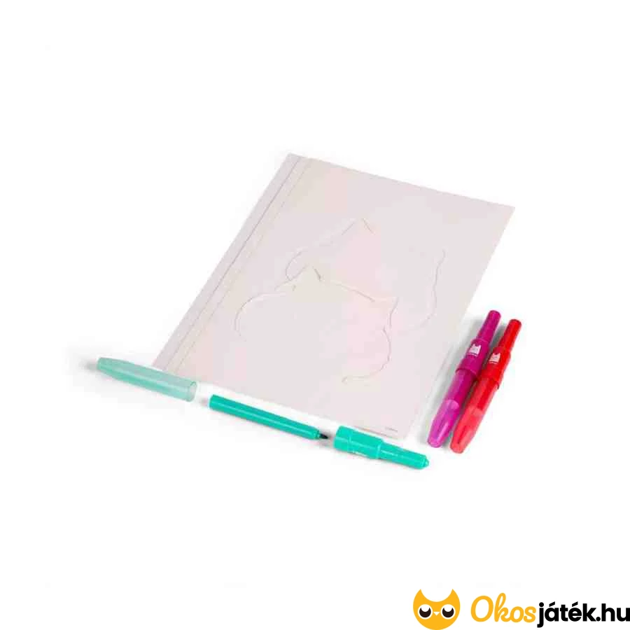 Csak felhelyezzük a kiválasztott sablont a papírra, majd a filctollba fújva elővarázsolhatjuk a színes mintákat!