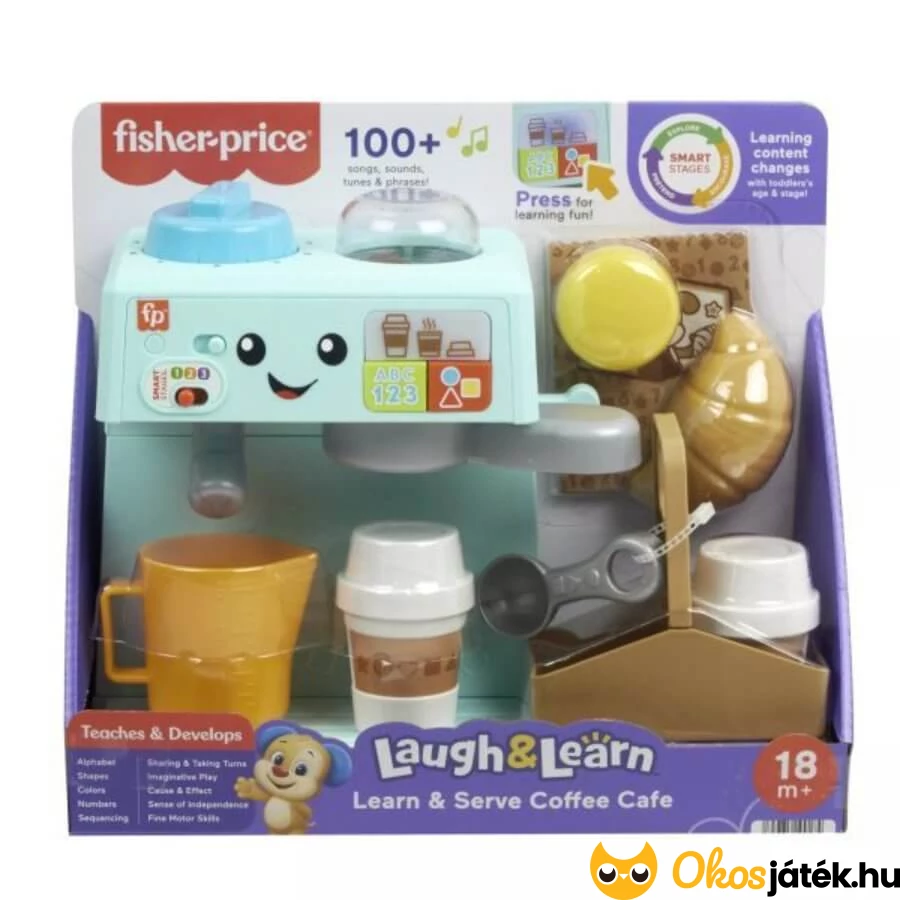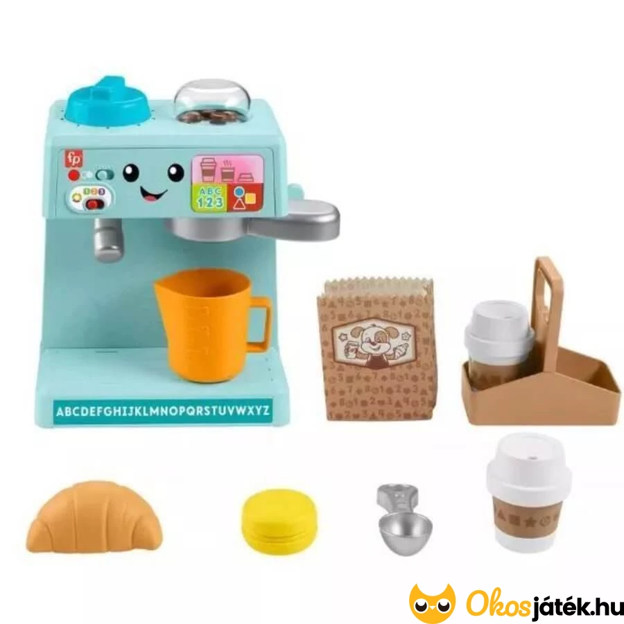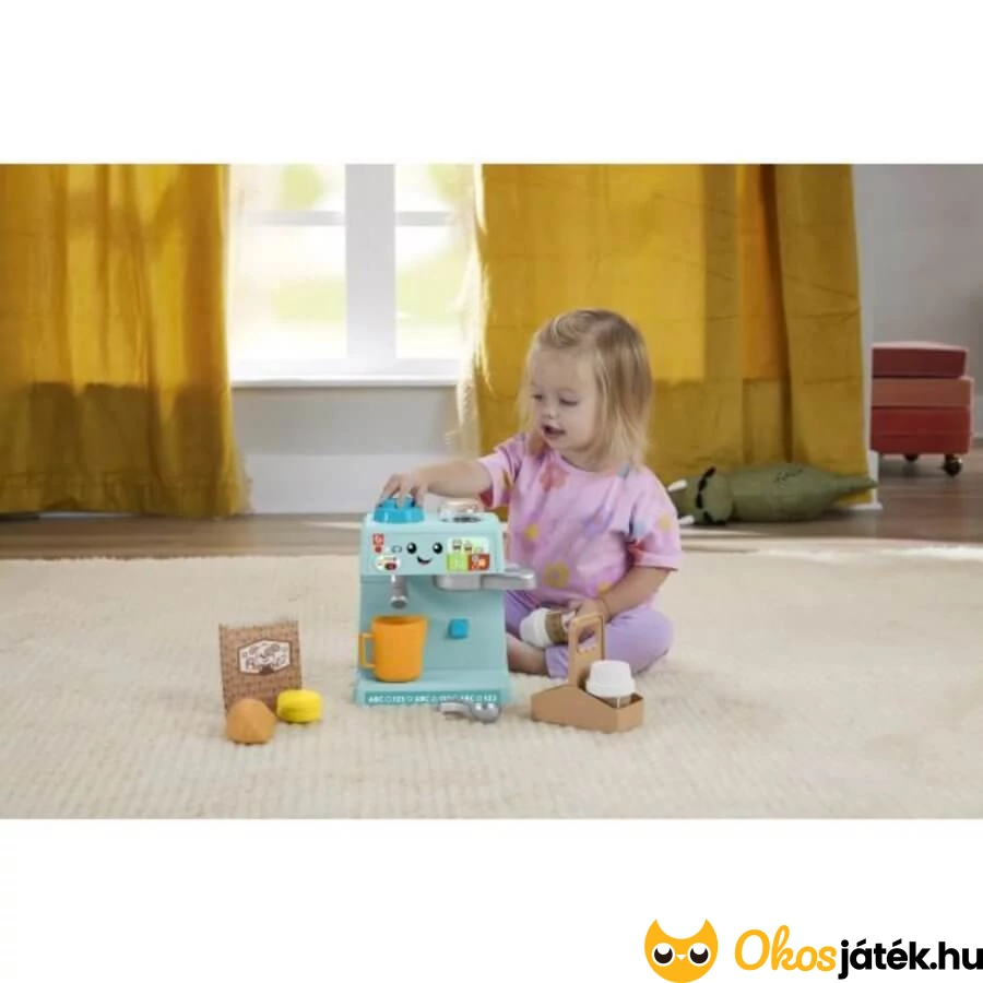 Fisher Price interaktív babarista kávéfőző szerepjáték kicsiknek, melyhez 10 kiegészítő tartozik. Több,  mint 100 dalt, hangot és kifejezést tanít a gyerekeknek.