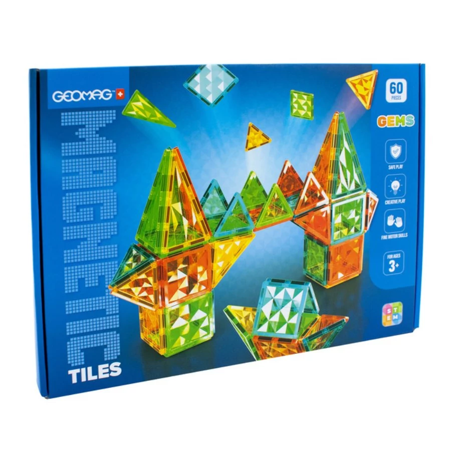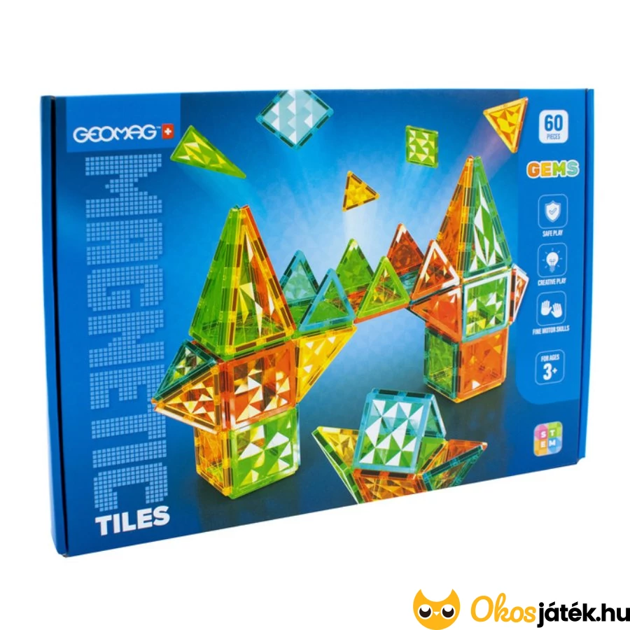 A Geomag Magnetic Tiles Gems készlet 60 színes, csillogó elemet tartalmaz, melyek éleiben elhelyezett mágnesek biztosítják a stabil összekapcsolódást.
