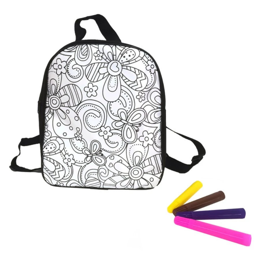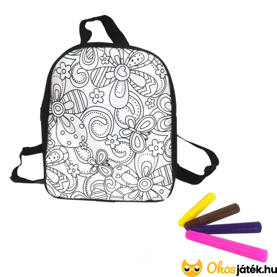 Aranyos kiszínezhető hátizsák virágos és pillangós mintákkal, melyek fehér alapon fekete kontúrosak. A szetthez tartozik négy filctoll is: barna, sárga, rózsaszín és lila színekben, melyekkel könnyen ki lehet díszíteni a kis táskát tetszés szerint. A hátizsák tetején van akasztó, valamint a két pántja állítható hosszú. A táska cipzáras, egyterű, melybe több kisebb dolog is könnyedén elférhet.