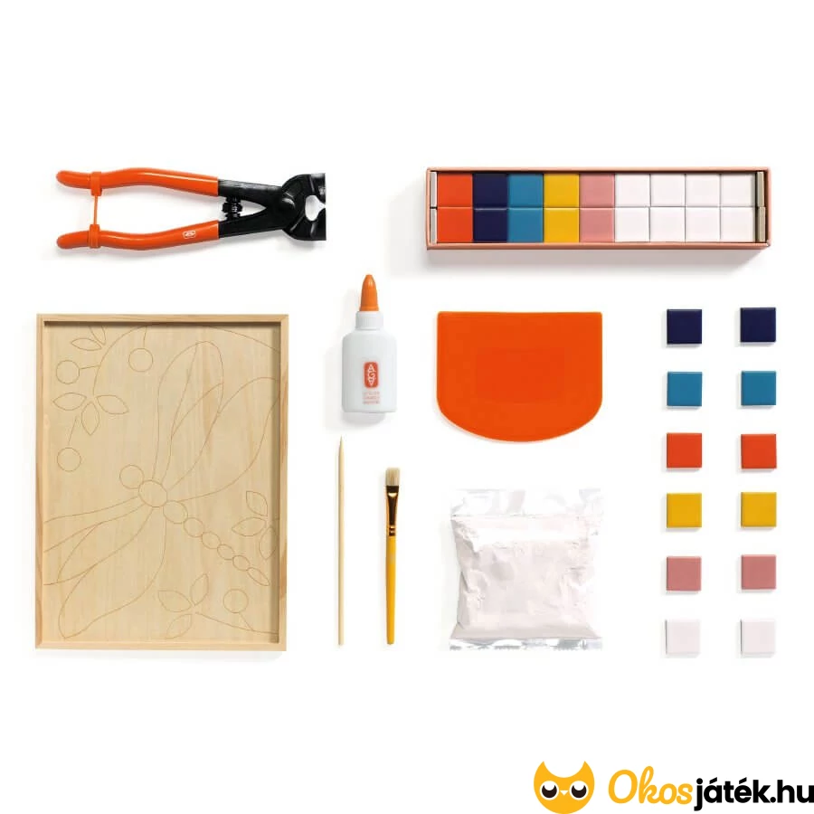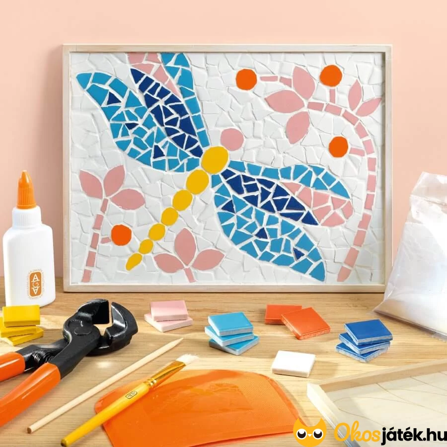 A készlettel egy látványos szitakötőt lehet kirakni apró csempedarabokból, ráadásul az elkészült képet még ki is lehet fugázni. A szett minden eszközt és hozzávalót is tartalmaz, ami a meseszép kép elkészítéséhez szükséges. Így a kerámia csempéken kívül fogó, vagyis mini csempevágó, spatula, mintával ellátott fa alaplap, cement a fugázáshoz, ragasztó és mintasablon is tartozik a készlethez.