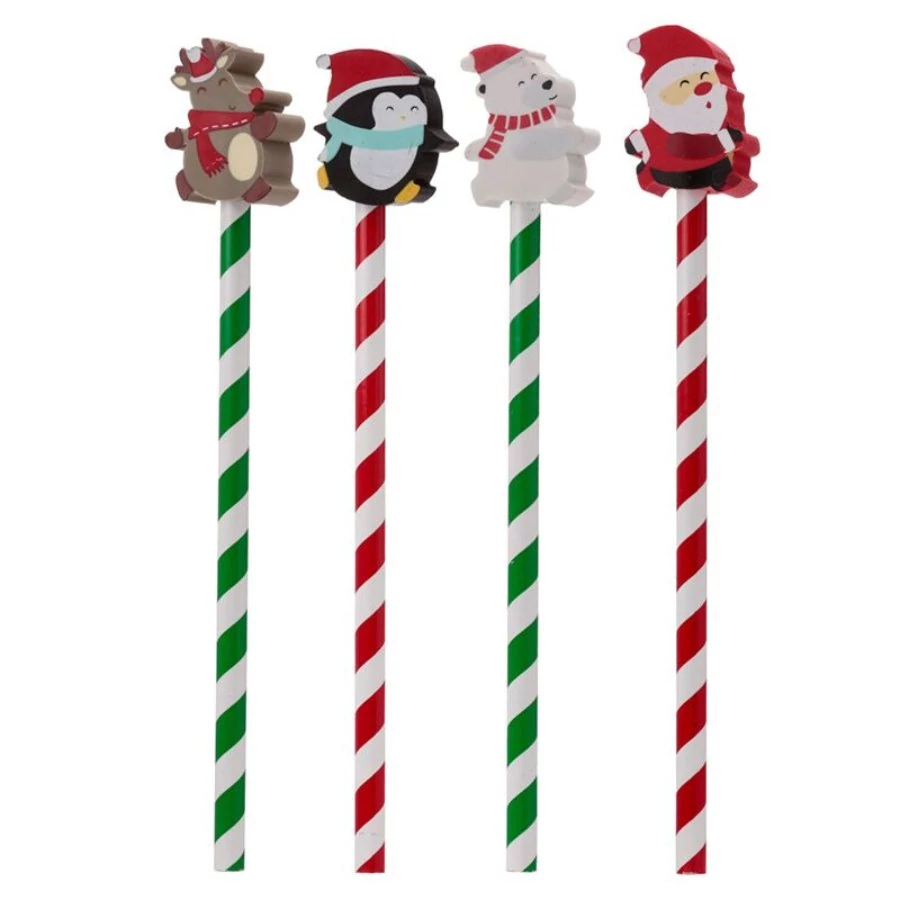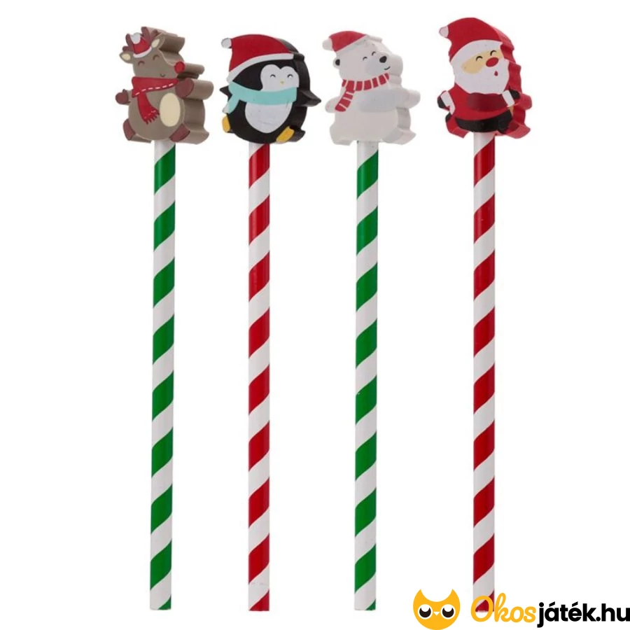 1 darab ünnepi hangulatú írószer, mely tökéletes választás mikulás és karácsonyi meglepetésként. A ceruza végén egy karácsonyi radír található: mikulás, rénszarvas. pingvin, jegesmaci.