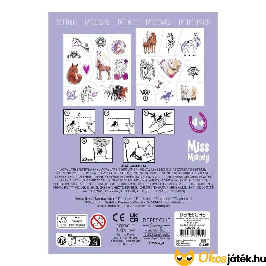 Miss Melody tetoválás a lovakat és pónikat kedvelő lányoknak. A készletben 2 ív tetkó található, amelyeken lovak, virágok, szív és pillangó látható.