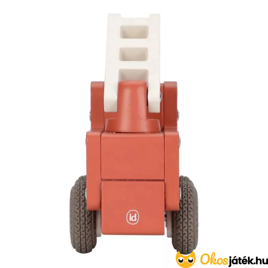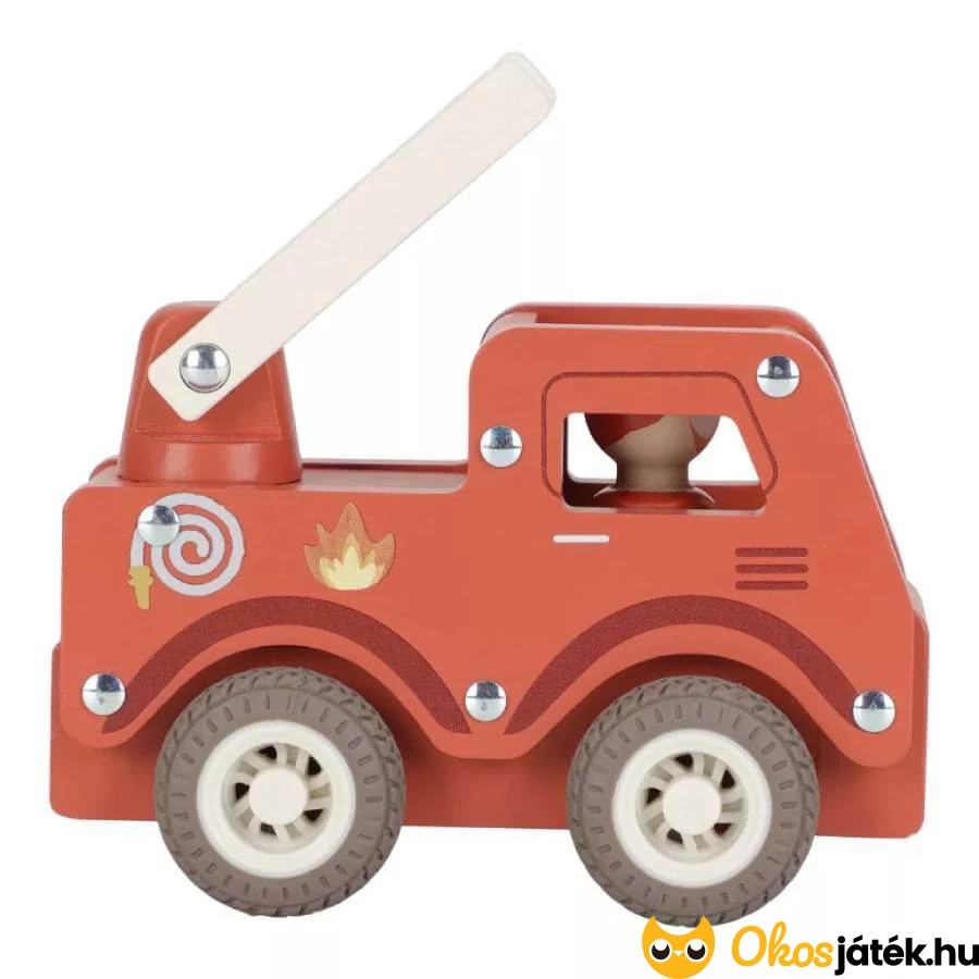 Minőségi fa játék tűzoltókocsi kisebb gyerekeknek. A játékautó kinyitható létrával rendelkezik, és a tűzoltófigura ki és betehető a vezetőfülkébe. A nyitott kialakításának köszönhetően a legkisebb kezek is könnyedén megfoghatják és irányíthatják a járművet, miközben saját történeteket alkothatnak, és izgalmas mentési kalandokat játszhatnak el.