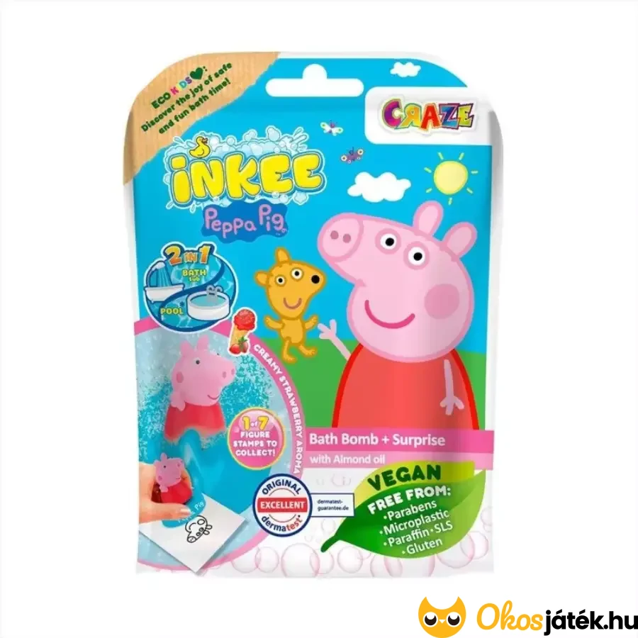 A Craze Inkee fürdőgolyó Peppa malac nyomdafigurával tökéletes választás egy vidám és biztonságos fürdőzéshez. A vegán összetevőkből készült fürdőbomba egy kedves Peppa malac témájú nyomdával teszi még különlegesebbé a pancsolást.