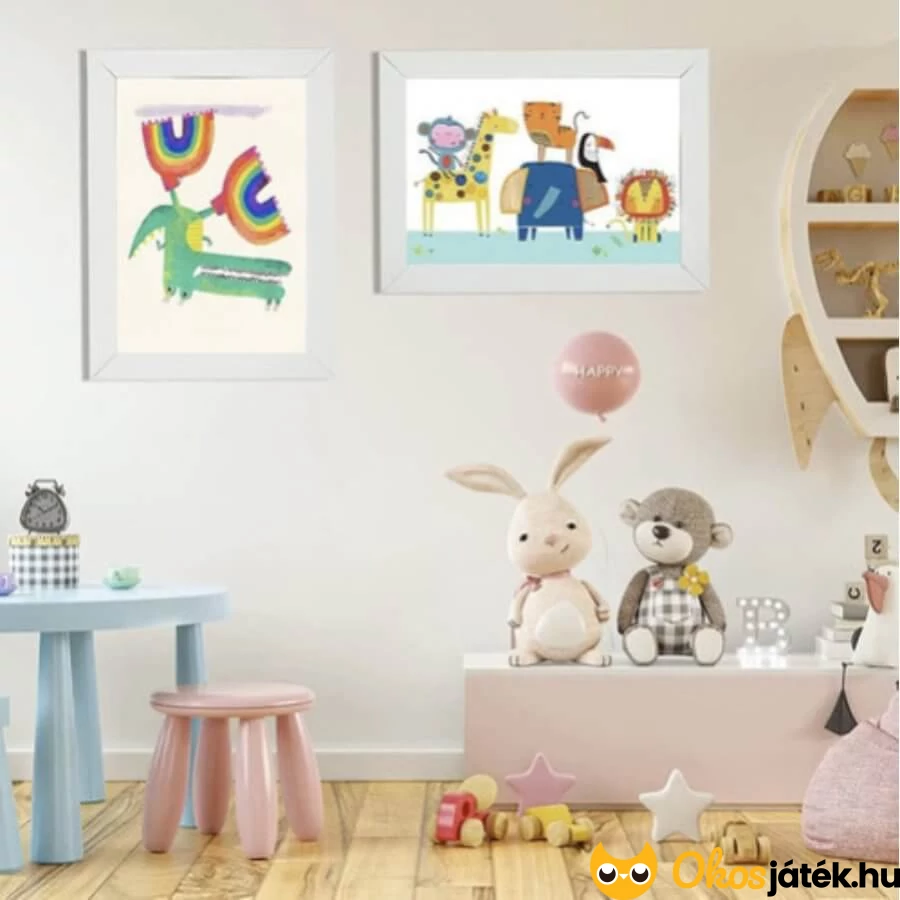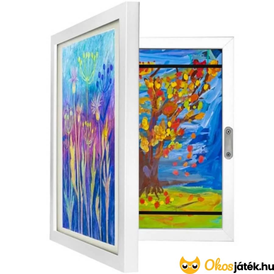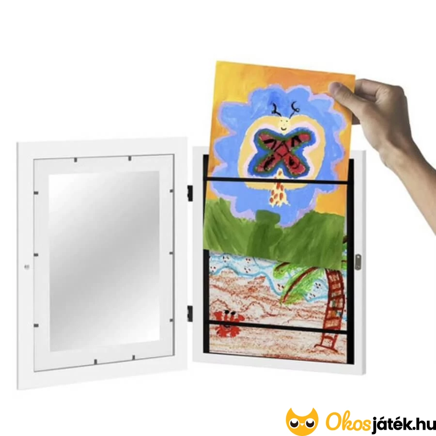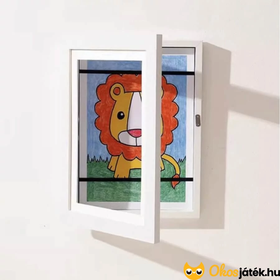 Praktikus és kreatív találmány gyerekrajzok falra rakásához, aminél nincs szükség ragasztószalagra, rajzszögre, hiszen a rajzok az átlátszó elejű, kinyitható képkeretbe helyezhetők.