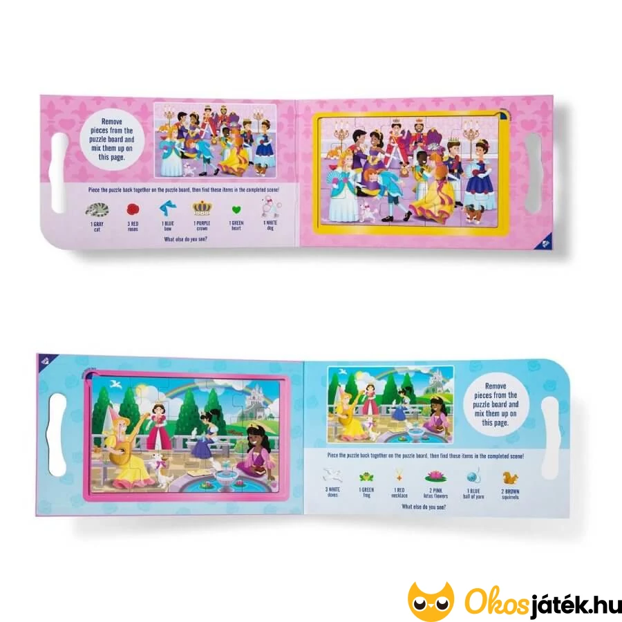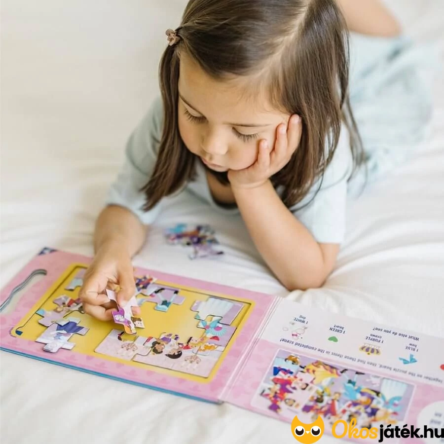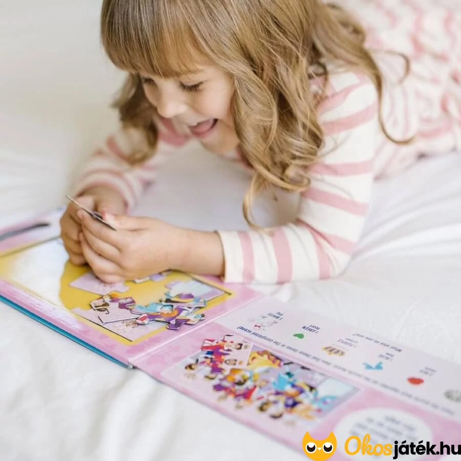 A készletben 2 különböző hercegnős történetet ábrázoló képet tudnak a gyerekek kitenni, melyek mindegyike 15 kirakó elemből áll. A puzzle részek és az alaplap is mágnesesek, így az összerakott képek nem esnek szét. Így az alkotás még nagyobb örömet okoznak a gyerekeknek.