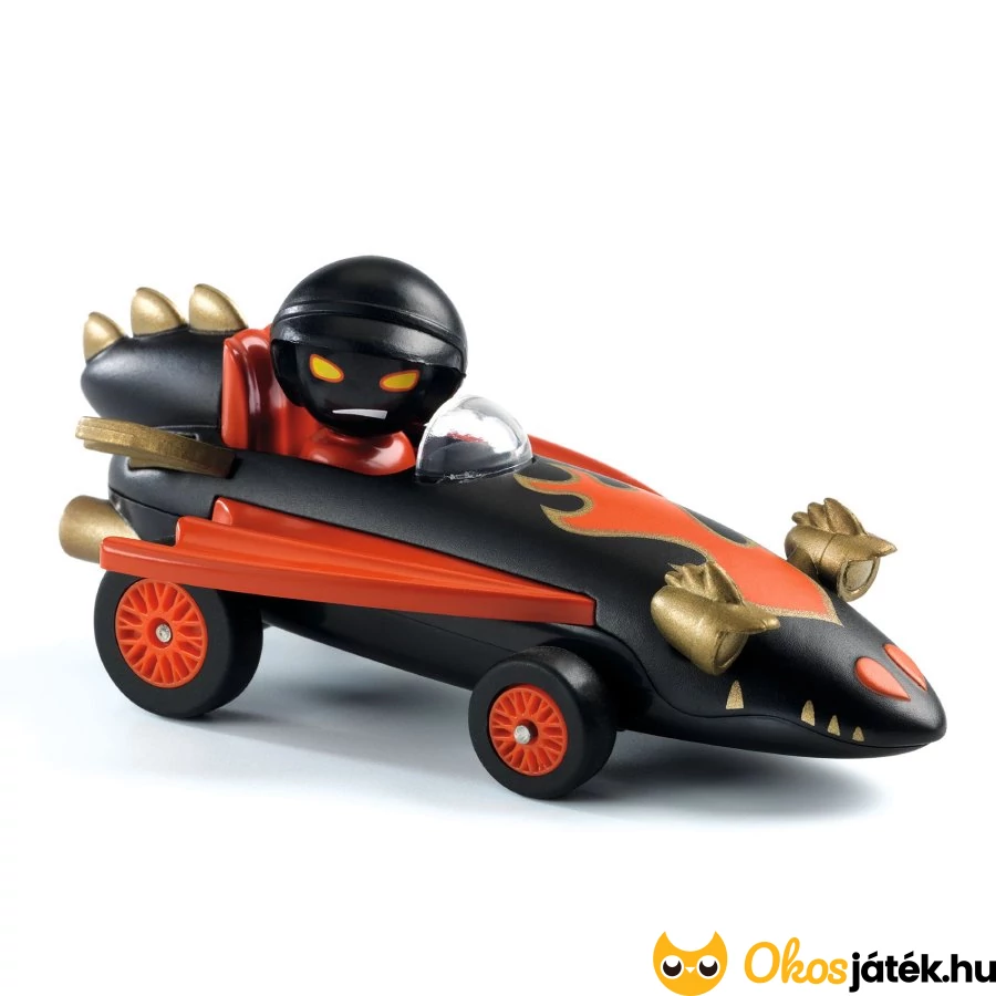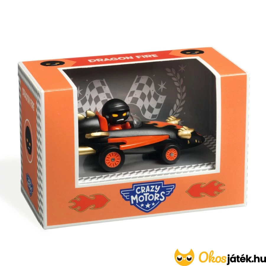 Sárkányos stílusvilágú versenyautó hozzá illő sofőr figurával a Djeco Crazy Motors sorozatából, melynek fém karosszériája, strapabíró műanyag elemei, ultrahangos festése és rugós felfüggesztése garantálja a könnyed gurulást különféle felületeken.