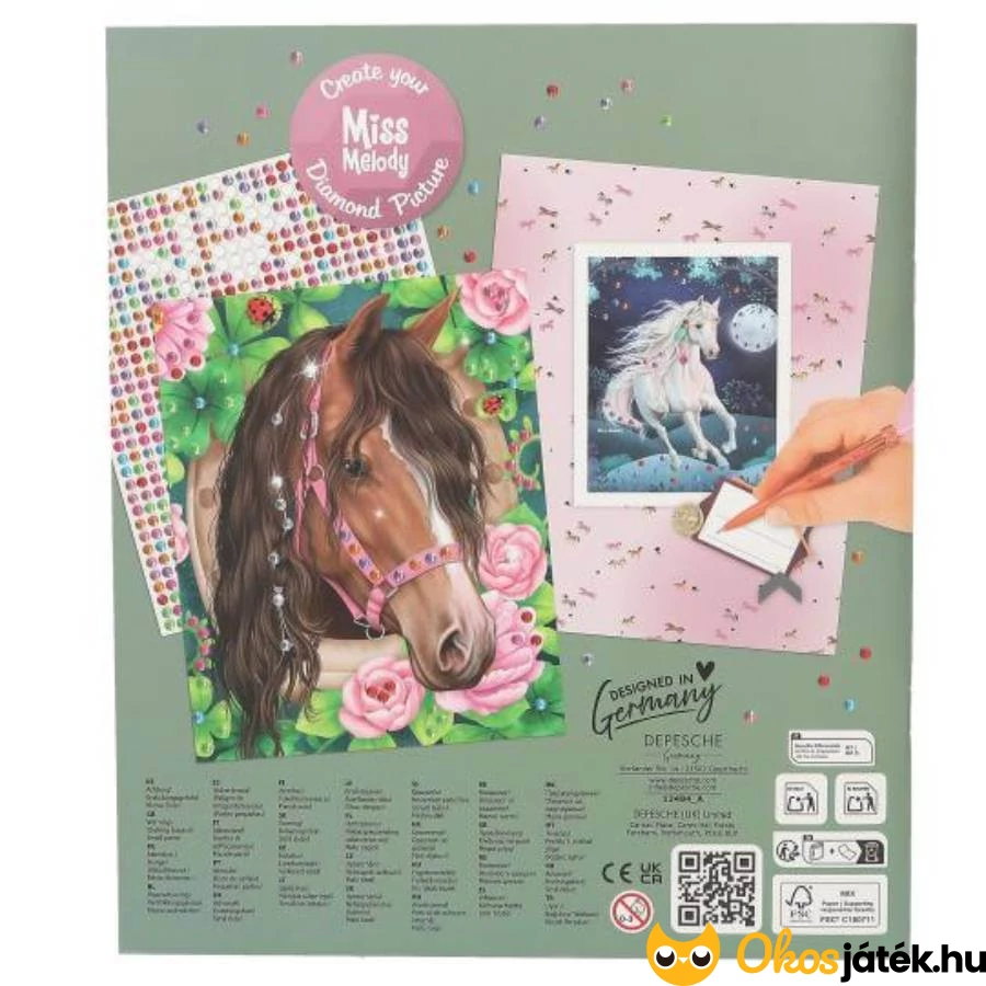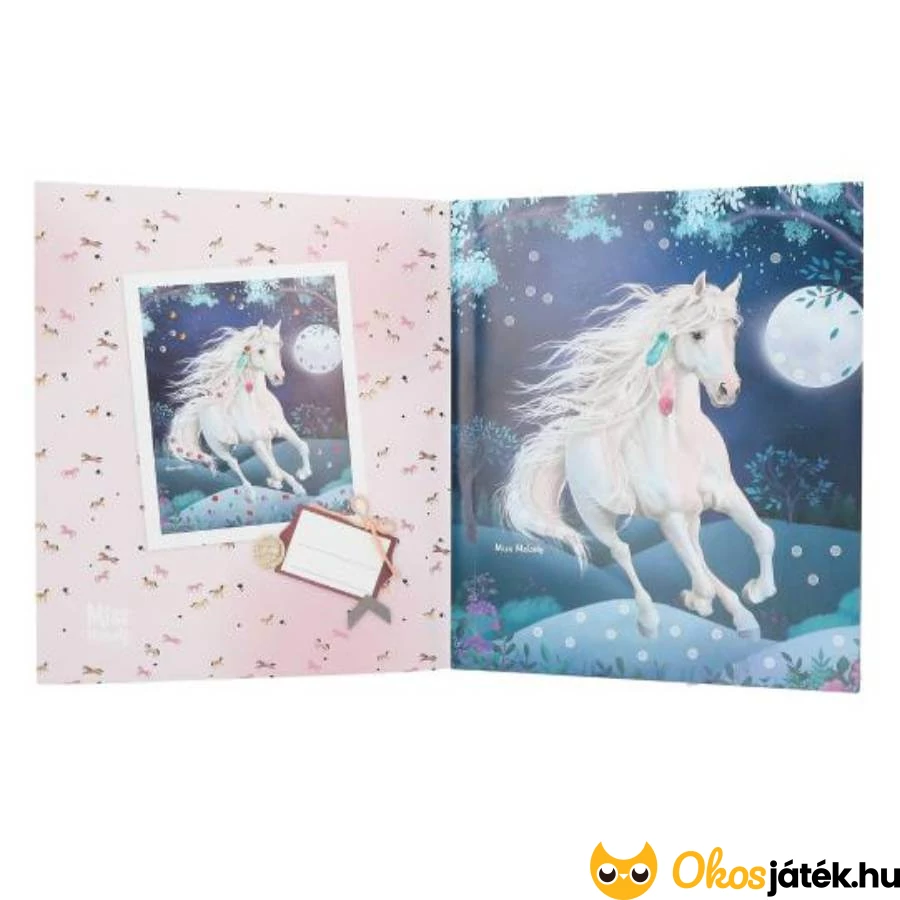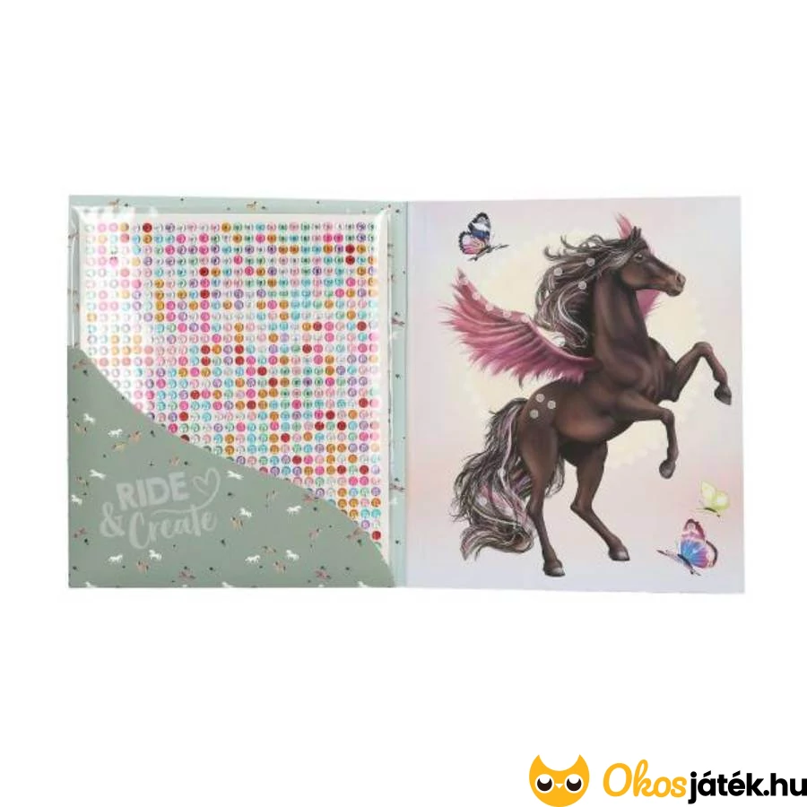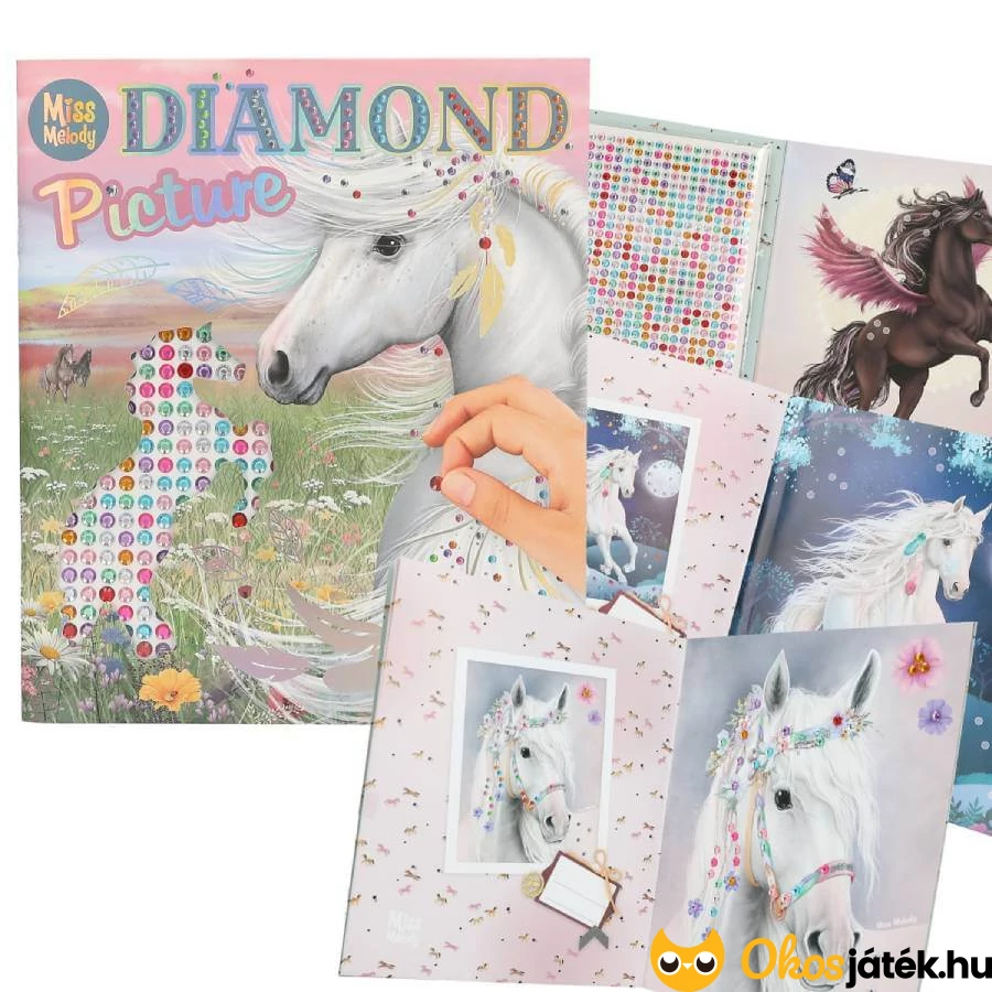 A könyvben tíz bájos ló található, melyek gyémántszerű, színes öntapadós matricákkal díszíthetőek. A mellékelt két színes matricalapon minden szükséges kiegészítő helyet kapott, hogy az elkészített képek valóban mesés fényben tündököljenek.
