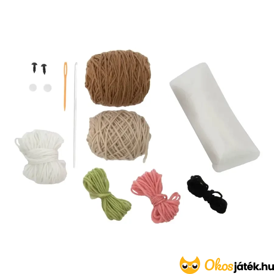 A szép fonalakat, eszközöket, tömőanyagot, gomb szemeket és képes útmutatót tartalmazó horgoló szettben nem található magyar nyelvű utasítás, de az ábrák segítenek a horgolt lovacska elkészítésében.
