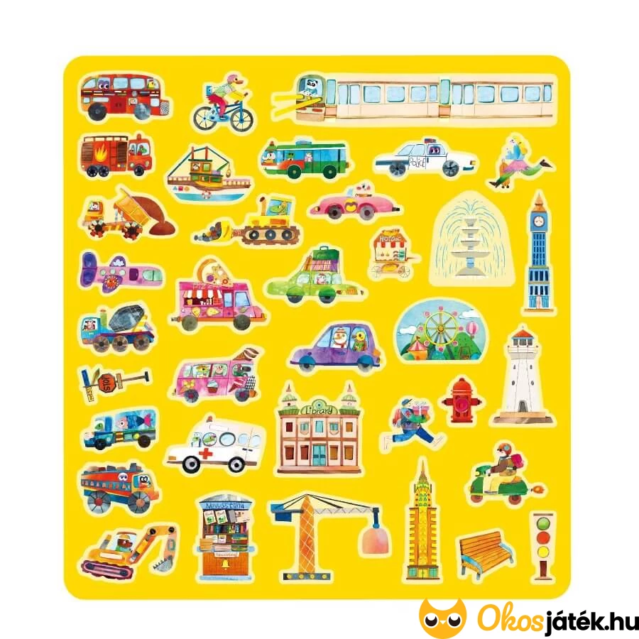Az egyik lapon minden matricának saját helye van, így a kicsik a megfelelő helyre ragasztva tárolhatják őket. Ez a lehetőség az azonosság felismerését kiválóan fejleszti. Érdemes megnevezni a különböző járműveket és ábrákat, így a szókincs is bővülhet.