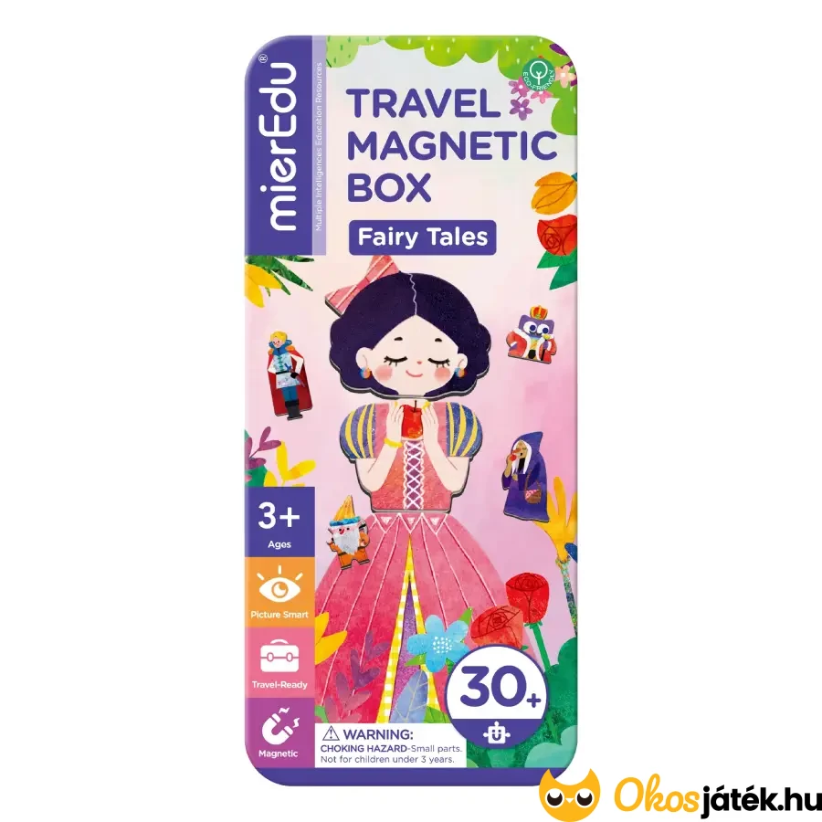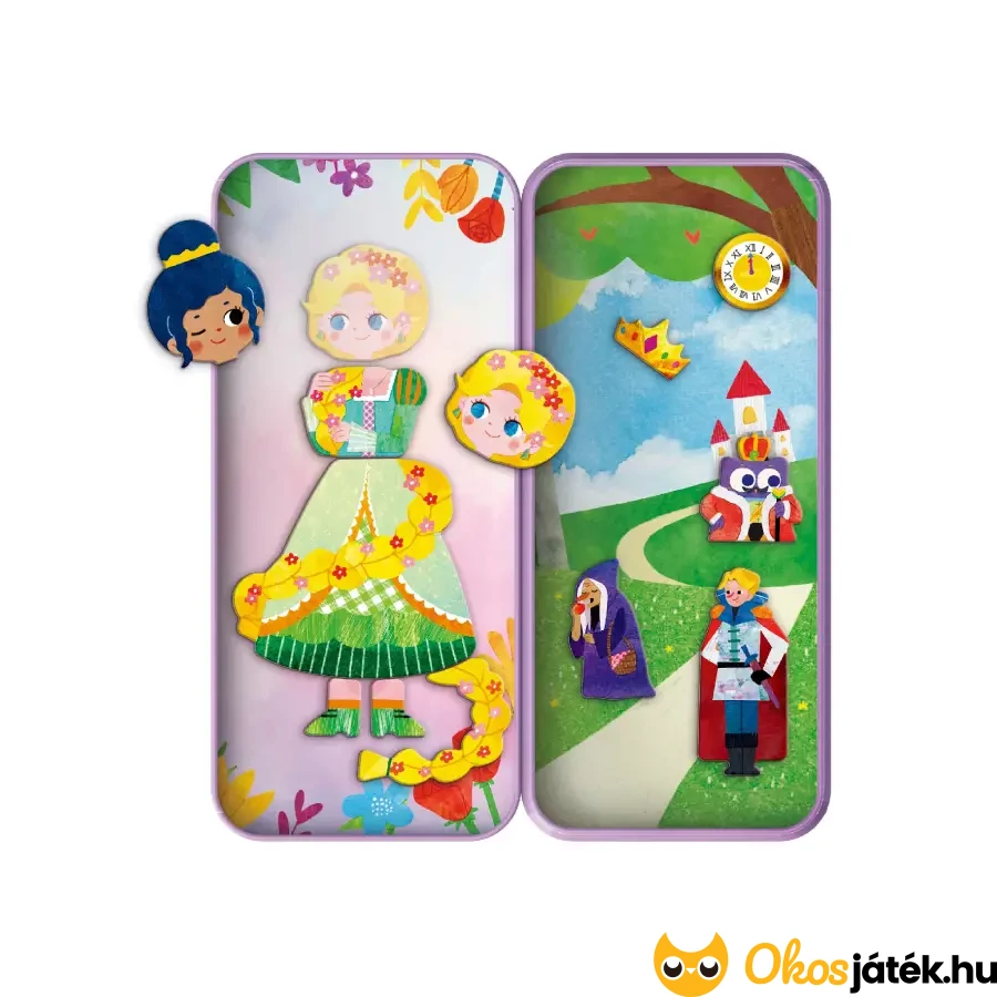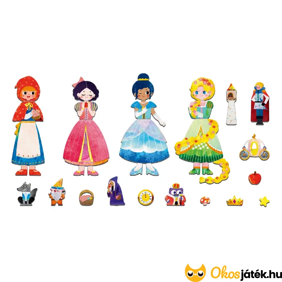 A készletben színes mágneses elemekkel a gyerekek mesebeli jeleneteket rakhatnak ki, mint pl. Hófehérke, Csipkerózsika, Piroska, Aranyhaj történetét.