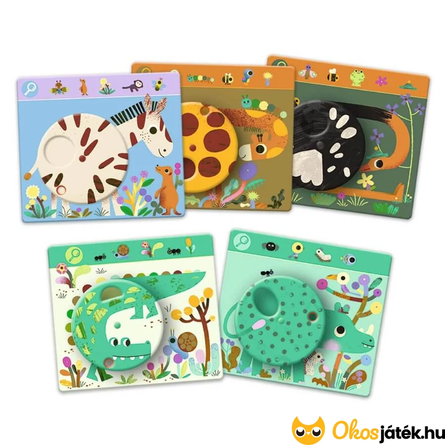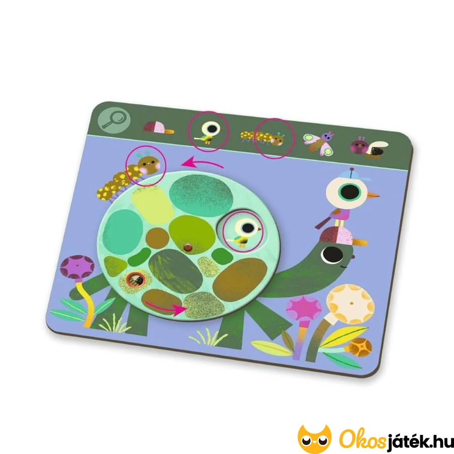 A rejtett képek-, a forgató-, és a kedves állatok miatt a Djeco képkeresős játéka izgalmas a kicsiknek, nem mellesleg pedig fejleszthető vele a megfigyelés, a türelem, a szem-kéz koordináció, a képfelismerés és a szókincset is bővíthetjük.