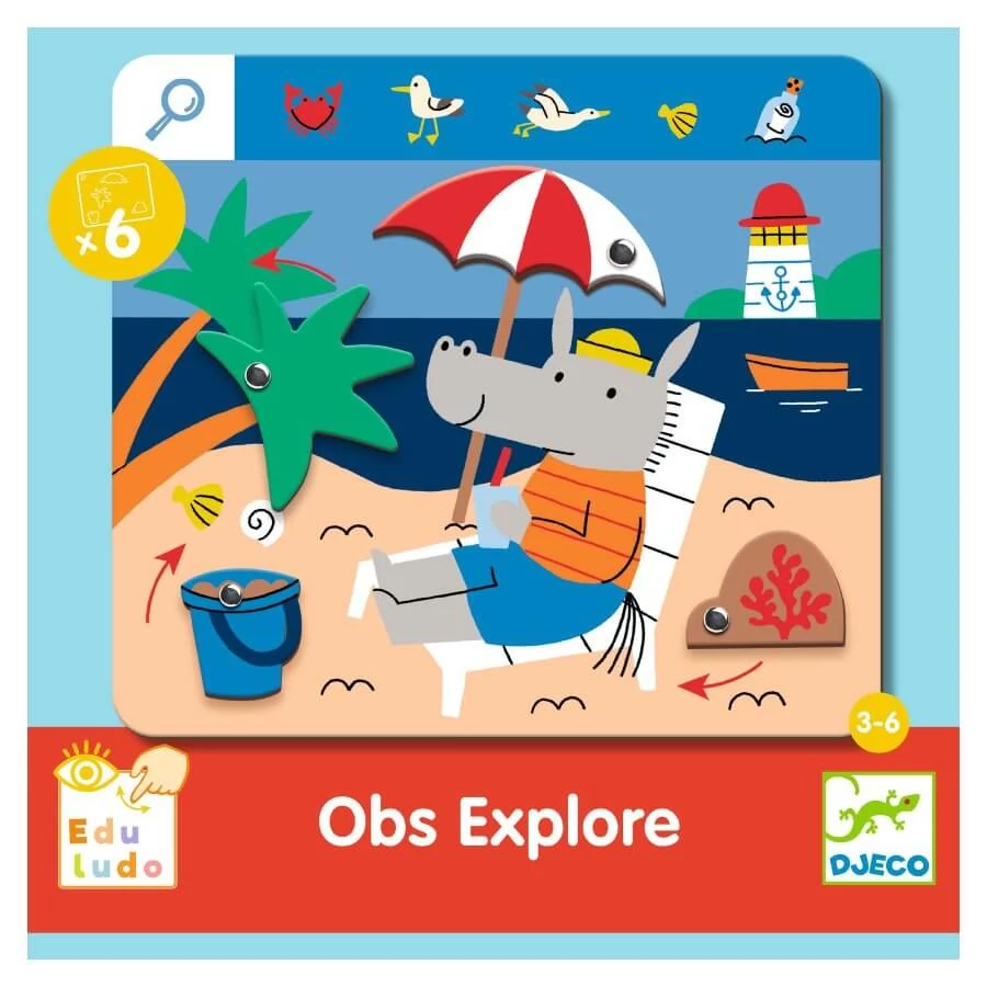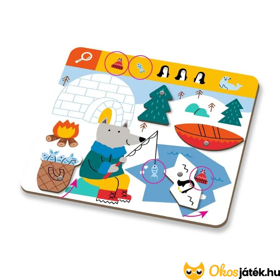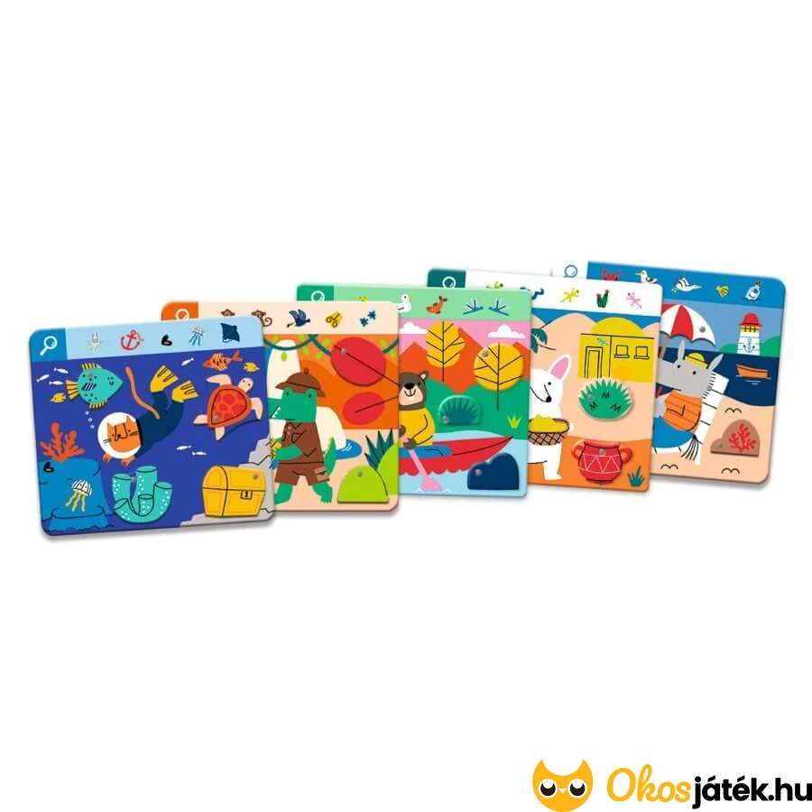 Készségfejlesztő böngészős és megfigyelős játék a Djeco játékgyártótól 3 éves kortól, melyben a gyerekek több képen keresgélhetnek különböző tárgyakat és állatokat miközben a játéktáblán mozgatják az elemeket.
